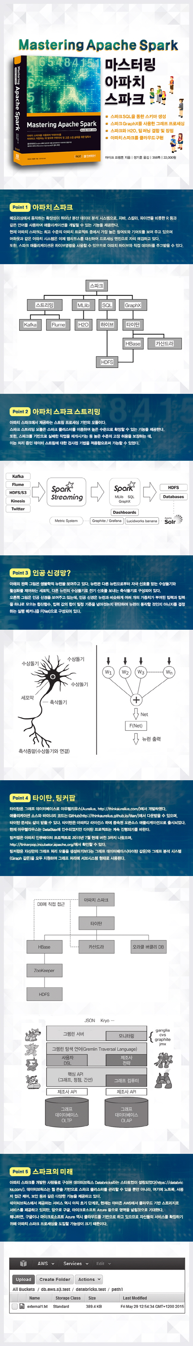 ÀÌ Ã¥¿¡¼ ´Ù·ç´Â ³»¿ë: ÇÁ·Î¼¼½Ì°ú ½ºÅ丮Áö¸¦ À§ÇÑ È®Àå Åø MLlibÀ» »ç¿ëÇÏ¿© Ŭ·¯½ºÅ͸µ°ú ºÐ·ù±â¹ý ±¸Çö Flume°ú HDFS¸¦ ÅëÇÑ ½ºÆÄÅ© ½ºÆ®¸² ÇÁ·Î¼¼½Ì ÀÌÇØ ½ºÆÄÅ© SQLÀ» ÅëÇÑ ½ºÅ°¸¶ »ý¼º ¹× µ¥ÀÌÅÍ ÀÔ·Â ½ºÆÄÅ© GraphX¸¦ »ç¿ëÇÑ ½ºÆÄÅ© ±â¹ÝÀÇ ±×·¡ÇÁ ÇÁ·Î¼¼½Ì ½ºÆÄÅ©¿Í H2O, µö ·¯´× °áÇÕ ¹× ÀÌ¿¡ µû¸¥ ÀåÁ¡ ¾ÆÆÄÄ¡ ½ºÆÄÅ©ÀÇ ´ëÇ¥Àû ±×·¡ÇÁ ½ºÅ丮Áö - ŸÀÌź, HBase, Ä«»êµå¶ó ºñ±³ ¾ÆÆÄÄ¡ ½ºÆÄÅ©¸¦ Ŭ¶ó¿ìµå »ó¿¡¼ ±¸ÇöÇϱâ À§ÇØ »ç¿ëµÇ´Â µ¥ÀÌÅͺ긯½º¿Í AWS