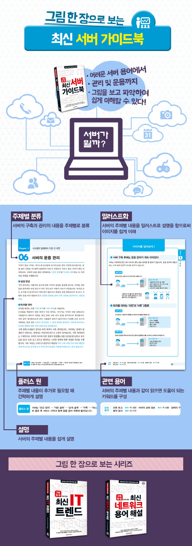 ÀÌ Ã¥Àº ÀÌ¿Í °°ÀÌ ¾îÁö·¯¿ï Á¤µµ·Î º¯È¸¦ °ÅµìÇϰí ÀÖ´Â ¼¹ö¸¦ »¡¸® ÆÄ¾ÇÇÏÁö ¾ÊÀ¸¸é ¾ÈµÇ´Â ¡®½ÅÂü IT ¿£Áö´Ï¾î¡¯³ª ¡®ºñ IT ¿£Áö´Ï¾î¡¯ ºÐµéÀ» ´ë»óÀ¸·Î ±¸¼ºÇÏ¿´½À´Ï´Ù. ÁøºÎÇÑ Ç¥ÇöÀ̱â´Â ÇÏÁö¸¸ ´©±¸³ª óÀ½¿¡´Â Ãʺ¸ÀÚÀÔ´Ï´Ù. Ãʺ¸Àڵ鿡°Ô ¼¹ö ¿ë¾î¸¦ Àß Á¤¸®ÇÒ ¼ö ÀÖµµ·Ï °¡´ÉÇÑ ÇÑ ¼ÒÇÁÆ®¿þ¾î³ª ¼ºñ½º À̸§À» ¹®Àå ¼ÓÀ̳ª ±×¸² ¼Ó¿¡ ¸¹ÀÌ »ç¿ëÇÏ¿´°í, ¼¹ö°¡ °®°í ÀÖ´Â ±â´É°ú ¿ªÇÒ¿¡ ´ëÇÑ À̹ÌÁö¸¦ ½±°Ô ÀâÀ» ¼ö ÀÖµµ·Ï ÀÏ·¯½ºÆ®·Î Ç¥ÇöÇϰí ÀÖ½À´Ï´Ù.
