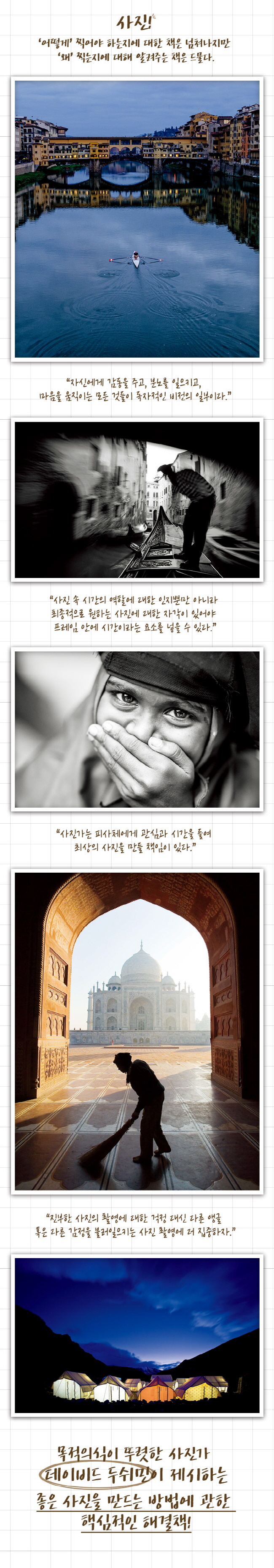 ¡ºÇÁ·¹ÀÓ ¾È¿¡¼¡»´Â ±× ¹æ¹ýÀ» ´ã¹éÇÏÁö¸¸ ¼³µæ·Â ÀÖ´Â ¾ð¾î·Î ÈǸ¢ÇÑ »çÁøÀ» ¸¸µå´Â ¹æ¹ýÀÇ ÇÙ½ÉÀ» ¼³¸íÇÑ´Ù. Àΰ£°ú Àå¼ÒºÎÅÍ Ä«¸Þ¶ó±îÁö ÀÌÇØÇÏ´Â °æÇèÀÌ Ç³ºÎÇÑ ¿©Çà°¡ÀÎ µ¿½Ã¿¡ ³¯Ä«·Î¿î °üÂûÀÚ¿Í ÇÔ²² ¼¼»óÀ¸·Î ³ª°¡´Â °ÍÀÌ´Ù. µÎ½¬¹ÎÀº ¿¹¼ú°¡¿Í ±â¼úÀÚ, ±â±³°¡¿Í ½ºÅ丮ÅÚ·¯ »çÀÌÀÇ °¥µîÀ» ÇØ¼ÒÇÏ´Â ¹æ¹ýÀ» º¸¿©ÁÙ »Ó¸¸ ¾Æ´Ï¶ó °øÁ¸ÇÏ´Â ¹æ¹ýÀ» ¾Ë·ÁÁØ´Ù. Ä«¸Þ¶ó¶ó´Â ±â°è¸¦ Àΰ£ÀÇ »ý°¢°ú ¸¶À½ÀÇ ¿¬Àå¼±À¸·Î ¸¸µå´Â µµ±¸¿Í Á¤º¸¸¦ Á¦°øÇÑ´Ù. ±×¸®°í ±×ÀÇ ¿©Á¤¿¡ µ¿ÇàÇÒ ¼ö ÀÖ´Â Áöµµ¸¦ °Ç³×ÁÙ °ÍÀÌ´Ù.