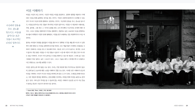 ÇÊÀÚ´Â ÀÌ Ã¥¿¡¼ ¡°ºñÀü¡±À̶ó´Â ´Ü¾î¸¦ °úµµÇÏ°Ô »ç¿ëÇÑ´Ù. ±× ´Ü¾î´Â ºÎÁ¦¿¡µµ ÀÖ°í, °¢ ÀåÀÇ Ç¥Á¦¿¡µµ ÀÖÀ¸¸ç, Ã¥ÀÇ º»¹®¿¡µµ ¼ö¾øÀÌ µîÀåÇÑ´Ù. ±×°ÍÀº ÇÊÀÚ°¡ °Ç¸ÁÁõÀÌ ÀÖ´Â °Íµµ ¾Æ´Ï°í, ÆíÁýÀÚ¸¦ ÇູÇÏ°Ô ¸¸µé±â À§ÇØ ±ÛÀ» ±æ°Ô ´ÃÀÌ·Á´Â ¸ñÀûµµ ¾Æ´Ï´Ù. ÀÌ Ã¥Àº »ç¶÷µé, Àå¼Òµé ±×¸®°í ¹®È¸¦ ´ã´Â °·ÄÇÑ »çÁø¿¡ ´ëÇÑ ³»¿ëÀ̱⠶§¹®¿¡ ±× ¼ÒÀçµéÀ» »çÁøÀ¸·Î Ç¥ÇöÇÏ·Á´Â ºñÀü°ú ¿å±¸°¡ ¾ø´Ù¸é ±×·± »çÁøÀ» ÃÔ¿µÇÒ ÀÌÀ¯°¡ ¾ø´Ù. ÇÊÀÚ´Â µ¶ÀÚµéÀÌ ÀÌ Ã¥¿¡¼ ¾ò´Â °ÍÀÌ Çϳª ÀÖ´Ù¸é, ±×°ÍÀÌ ¸íÈ®ÇÑ ±â¼úÀ» ÅëÇØ ÀÚ½ÅÀÇ ºñÀüÀ» ã°í Ç¥ÇöÇϰíÀÚ ÇÏ´Â »õ·Î¿î °áÀÇÀÌ±æ ¹Ù¶õ´Ù. ¶ÇÇÑ ÀÌ Ã¥ÀÌ ºñÀüÀ» ¸íÈ®È÷ Ç¥ÇöÇϱâ À§ÇÑ ±â¼úÀû µµ±¸µµ ¸î °¡Áö Á¦°øÇÏ±æ ¹Ù¶ó´Â ¸¶À½ÀÌ´Ù.
