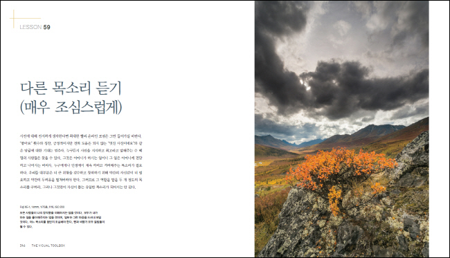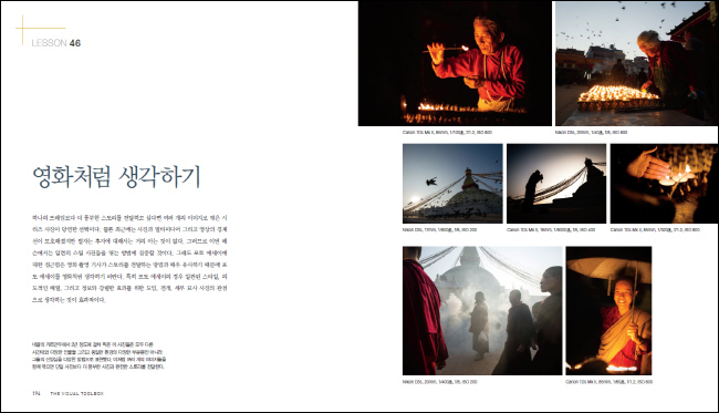 'THE VISUAL TOOLBOX'´Â Ä«¸Þ¶óÀÇ »ç¿ë¹ý»Ó ¾Æ´Ï¶ó °­·ÄÇÑ »çÁøÀ» ¸¸µå´Â ¹æ¹ý±îÁö ¹è¿ì±â À§ÇÑ »çÁø°¡ µ¥À̺ñµå µÎ½¬¹ÎÀÇ Ä¿¸®Å§·³ÀÌ´Ù. µÎ½¬¹ÎÀº 60°³ÀÇ ·¹½¼À» ÅëÇØ ¿¹¼úÀû µµ±¸ÀÇ È¿°úÀûÀΠȰ¿ë¹ýÀ» ¾Ë·ÁÁÖ°í, ´õ ±íÀº ½Ã°¢Àû °æÇèÀ» Á¦°øÇÏ´Â À̹ÌÁö¸¦ ¸¸µé±â À§ÇÑ ±â¹ÝÀ» ±¸ÃàÇÒ ¼ö ÀÖµµ·Ï µ½´Â´Ù. µÎ½¬¹ÎÀº ±â¼úÀûÀÎ ¸éÀ» ¼Ò°³Çϰí À绡¸® ±¸µµ, âÀÛ °úÁ¤ ±×¸®°í ÈǸ¢ÇÑ »çÁøÀ» ¸¸µé±â À§ÇÑ Çʼö ±âº» ¿ä¼Òµé·Î ³Ñ¾î°£´Ù; ±×´Â ±âº» ¿ä¼ÒµéÀ» º¸¿©ÁØ ´ÙÀ½ ¿ì¸®°¡ Á÷Á¢ ¿¬½ÀÇØº¸°í, ¾Æ¸§´ä°í °­·ÄÇÑ À̹ÌÁö¸¦ ¸¸µé±â À§ÇØ ´Ù¸¥ Á¢±Ù ¹æ½ÄÀ» ½ÃµµÇغ¼ ¼ö ÀÖµµ·Ï À¯µµÇÑ´Ù.