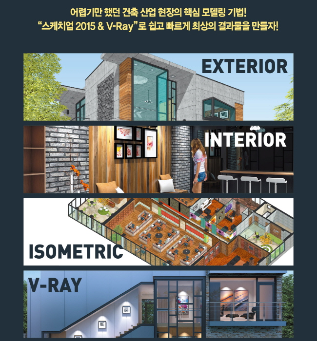 1. ½ºÄÉÄ¡¾÷°ú ºêÀÌ·¹À̸¦ Åëä·Î ¹è¿î´Ù. °ÇÃà ¹× ÀÎÅ׸®¾î ½Ç»ç À̹ÌÁö¸¦ À§ÇÑ ÇÙ½É ÇÁ·Î±×·¥ÀÎ ºêÀÌ·¹ÀÌ(V-ray)ÀÇ ±âº» ¸Å´º¾ó°ú Ȱ¿ë¹ýÀ» ¼ö·ÏÇÏ¿´À¸¸ç, ½Ç¹«¿¡¼ ÀÛ¾÷ÇÏ´Â ¹æ½Ä ±×´ë·Î ½ºÄÉÄ¡¾÷À¸·Î ¸ðµ¨¸µÀ» ¿Ï¼ºÇÏ°í ºêÀÌ·¹ÀÌ·Î ·»´õ¸µÀ» ¿Ï¼ºÇÒ ¼ö ÀÖµµ·Ï ±¸¼ºÇÏ¿´´Ù.