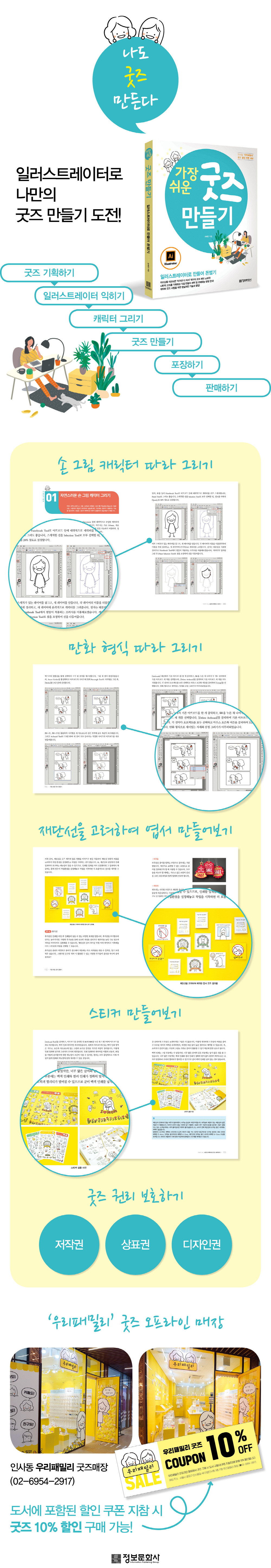 ÃÖ±Ù ¿¬¿¹ÀÎÀ̳ª ¾Ö´Ï¸ÞÀÌ¼Ç µî°ú °ü·ÃµÈ Á¦Ç°ÀÎ ±ÂÁ ¸¹ÀÌ ¼ÒºñÇϰí ÀÖÁö¸¸, ÀÌ´Â ÃÊ»ó±ÇÀ̳ª ÀúÀÛ±ÇÀ» À§¹èÇÏ´Â °æ¿ì°¡ ¹ß»ýÇÒ ¼ö ÀÖ´Ù. ±×·¡¼­ ÀÌ Ã¥¿¡¼­´Â ³»°¡ ±×¸®°í ½ÍÀº ³ª¸¸ÀÇ Ä³¸¯Å͸¦ ÀÏ·¯½ºÆ®·¹ÀÌÅÍ·Î ¸¸µé¾î ±ÂÁî·Î Á¦ÀÛÇϰí, ÆÇ¸ÅÇϱâ±îÁöÀÇ ¸ðµç °úÁ¤À» ´ã¾Ò´Ù. īī¿ÀÅå À̸ðƼÄÜ ¡®ÀÌ°Å¸é ´Ù µÇÁö¡¯ ÀÛ°¡°¡ óÀ½ºÎÅÍ °ÞÀº ½ÃÇàÂø¿À¿Í ½ÇÀü ³ëÇϿ츦 Ãʺ¸ÀÚµµ ½±°Ô ÀÌÇØÇÒ ¼ö ÀÖ°Ô ¼Ò°³ÇÏ¿´À¸¸ç, ´Ù¾çÇÑ ÆË¾÷ ½ºÅä¾î ¹× ¿ÀÇÁ¶óÀÎ ¸ÅÀå °æ¿µ °æÇèÀ» ¹ÙÅÁÀ¸·Î ½ÃÀÛÇÏ´Â »ç¶÷µé¿¡°Ô À¯¿ëÇÑ Á¤º¸¸¦ Á¦°øÇØÁØ´Ù. ƯÈ÷ Àλ絿¿¡ À§Ä¡ÇÑ ÀúÀÚÀÇ ¡®¿ì¸®ÆÐ¹Ð¸®¡¯ ¸ÅÀå¿¡ ¹æ¹®ÇÏ¿© ´Ù¾çÇÑ ±ÂÁ Á÷Á¢ º¸°í °æÇèÇØ º¼ ¼ö ÀÖÀ¸¸ç, Ã¥¿¡ Æ÷ÇÔµÈ ÄíÆùÀ» ÁöÂüÇÏ¸é ±ÂÁî ±¸¸Å ½Ã ÇÒÀεµ °¡´ÉÇÏ´Ù.