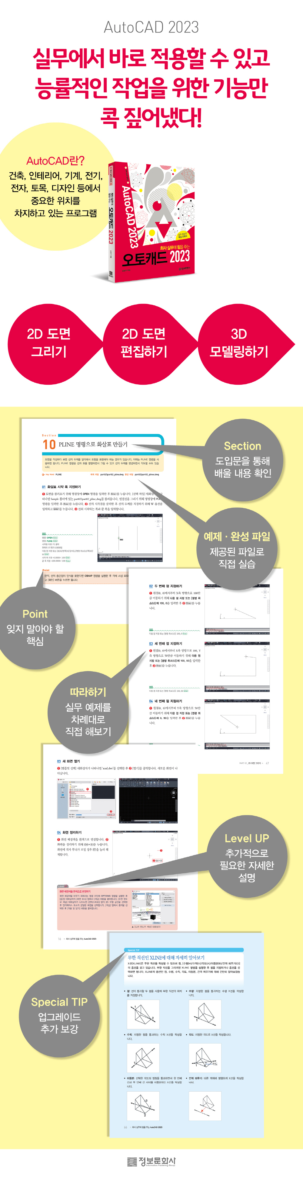 AutoCAD´Â ¼³°èÀÚ, µðÀÚÀ̳ʸ¦ ¼¼½ÉÇÏ°Ô °í·ÁÇØ °³¹ßµÈ ÇÁ·Î±×·¥À¸·Î °ÇÃà, ÀÎÅ׸®¾î, ±â°è, Àü±â, ÀüÀÚ, Åä¸ñ, »ê¾÷µðÀÚÀÎ, Á¦Ç°µðÀÚÀÎ, °¢Á¾ ¼³°è, µðÀÚÀÎ ºÐ¾ß¿¡¼ »ç¿ëÀÌ ¾È µÇ´Â °÷ÀÌ ¾ø½À´Ï´Ù. ±× Á¤µµ·Î ¿ÀÅäijµå´Â ¿ì¸® »ê¾÷ ºÐ¾ß¿¡¼ Áß¿äÇÑ À§Ä¡¸¦ Â÷ÁöÇϰí ÀÖ´Â ÇÁ·Î±×·¥ÀÔ´Ï´Ù. ÀÌ Ã¥Àº AutoCAD2023 ¼Ò°³·Î ½ÃÀÛÇÏ¿© 2D µµ¸éÀ» ±×¸®°í ÆíÁýÇÏ¿© 3D¸ðµ¨¸µ±îÁö ¼³¸íÇϰí, ¸¶Áö¸· ½Ç¹« ¿¹Á¦·Î Æò¸éµµ¿Í ÀԸ鵵, Åõ½Ãµµ±îÁö ¸¸µé¾îº¼ ¼ö ÀÖ½À´Ï´Ù. °¢ ÆÄÆ® ¾È¿¡ ª°Ô ¼½¼ÇÀ¸·Î ³ª´©¾î ÇÊ¿äÇÑ ºÎºÐÀ» ã¾Æº¼ ¼ö ÀÖÀ¸¸ç, ¿¹Á¦ ÆÄÀϰú ¿Ï¼º ÆÄÀÏÀ» Á¦°øÇÔÀ¸·Î½á À̸¦ Ȱ¿ëÇÏ¿© ´õ¿í ½Ç·ÂÀ» Çâ»ó½Ãų ¼ö ÀÖ½À´Ï´Ù. Â÷±ÙÂ÷±Ù Ã¥À» º¸¸ç µû¶óÇÏ´Ùº¸¸é ÇÙ½É ³»¿ëÀº ¡®Æ÷ÀÎÆ®¡¯·Î, ´õ ¾Ë¸é À¯ÀÍÇÑ ³»¿ëÀº ¡®·¹º§¾÷¡¯À¸·Î, ÀØÁö ¸»¾Æ¾ß ÇÒ ³»¿ëÀº ¡®½ºÆä¼È ÆÁ¡¯À¸·Î ±¸ºÐÇÏ¿© Ãß°¡ÇÏ¿´±â ¶§¹®¿¡ ÇнÀ¿¡ ´õ¿í À¯¿ëÇÕ´Ï´Ù.