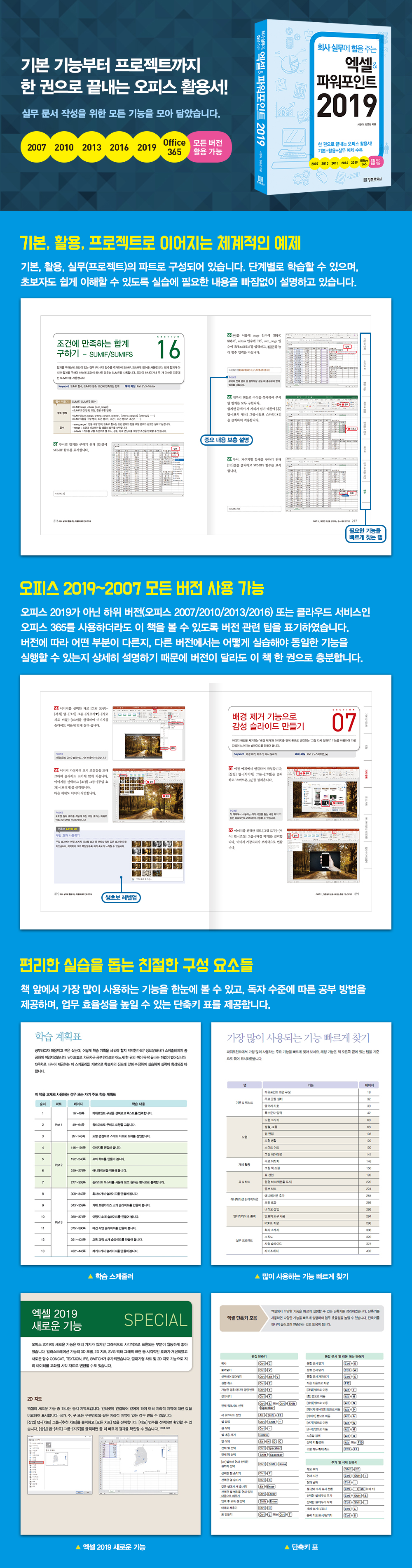 Ã¥ ¾Õ¿¡¼­ Á¦°øÇÏ´Â <°¡Àå ¸¹ÀÌ »ç¿ëµÇ´Â ±â´É ºü¸£°Ô ã±â> Ç¥¸¦ ÅëÇØ ¸¹ÀÌ »ç¿ëÇÏ´Â ±â´ÉÀ» ÇÑ´«¿¡ º¼ ¼ö ÀÖÀ¸¸ç, 13ÁÖÂ÷·Î ³ª´©¾î Á¦°øÇÏ´Â ½ºÄÉÁÙ·¯ÀÎ <ÇнÀ °èȹǥ>¸¦ ÅëÇØ ±³Àç·Î »ç¿ëÇϰųª ½º½º·Î ÇнÀÇÒ ¶§ µµ¿òÀ» ¾òÀ» ¼ö ÀÖ½À´Ï´Ù. µ¶ÀÚ ¼öÁØ¿¡ µû¸¥ °øºÎ ¹æ¹ýÀ» Á¦°øÇϸç Ã¥ µÚ¿¡´Â <¿¢¼¿ 2019>¿Í <ÆÄ¿öÆ÷ÀÎÆ® 2019>ÀÇ »õ·Î¿î ±â´ÉÀ» ¸ð¾Æ ½Ç¾ú°í, ´Ù¾çÇÑ ±â´ÉÀ» ºü¸£°Ô ½ÇÇàÇÏ¿© ¾÷¹« È¿À²¼ºÀ» ³ôÀÏ ¼ö ÀÖ´Â ´ÜÃàŰ Ç¥¸¦ Á¦°øÇÕ´Ï´Ù.