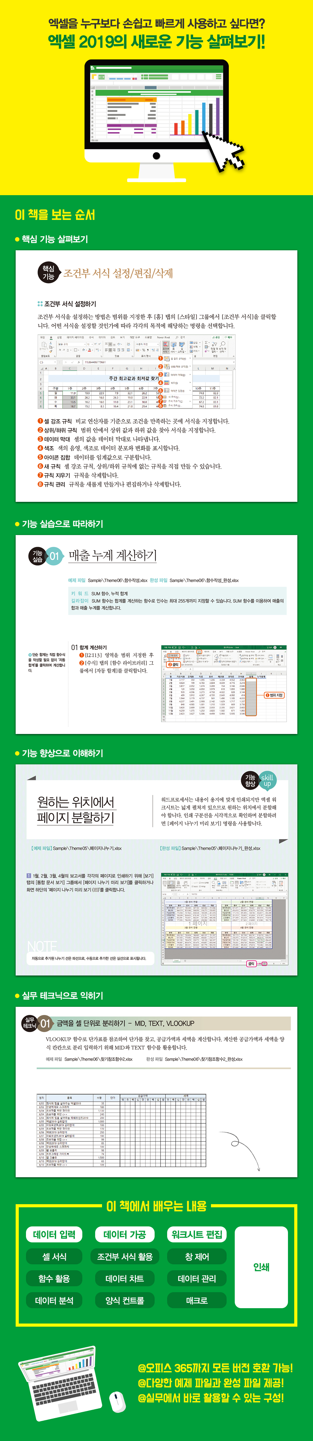ÀÌ Ã¥Àº ¿¢¼¿ 2019 ÃֽйöÀüÀ» ±â¹ÝÀ¸·Î »õ·Ó°Ô Ãß°¡µÈ ±â´ÉºÎÅÍ ÀÚÁÖ »ç¿ëµÇ´Â ¸Þ´º±îÁö 9°³ÀÇ Å׸¶·Î ±¸¼ºÇÏ¿© ¼³¸íÇÑ´Ù. ÀÔ¹®ÀÚµµ ÀÌÇØÇϱ⠽±µµ·Ï ÇÙ½É ±â´ÉÀ¸·Î ½ÃÀÛÇÏ¿© Áß°£ Áß°£ ½Ç¹«¿¡¼ ´Ù³â°£ °ÀÇ·Î ´ÙÁ®Áø ÀúÀÚÀÇ ÆÁµéÀÌ º¸ÅÆÀ» ´õÇÑ´Ù. ÀÌ·ÐÀ¸·Î ¹è¿î ÈÄ ¹Ù·Î ±â´É ½Ç½ÀÀ¸·Î ³Ñ¾î°¡ ÇϳªÇϳª Á÷Á¢ µû¶óÇØ º¸¸ç Áøµµ¸¦ ³ª°¥ ¼ö ÀÖ´Ù. ±âº» ±â´ÉÀ» ¹è¿î ÈÄ¿¡´Â ½Ç¹«¿¡¼ Ȱ¿ë °¡´ÉÇÑ Çâ»óµÈ ½ºÅ³µé°ú ÀÚÁÖ »ç¿ëµÇ´Â ³»¿ëµéÀ» ¸ð¾Æ ³ëÇÏ¿ì·Î Àü´ÞÇϱ⠶§¹®¿¡ ¾ËÂ÷°Ô ÇÑ ±ÇÀ» ¸¶¹«¸® ÇÒ ¼ö ÀÖµµ·Ï ±¸¼ºµÇ¾î ÀÖ´Ù.