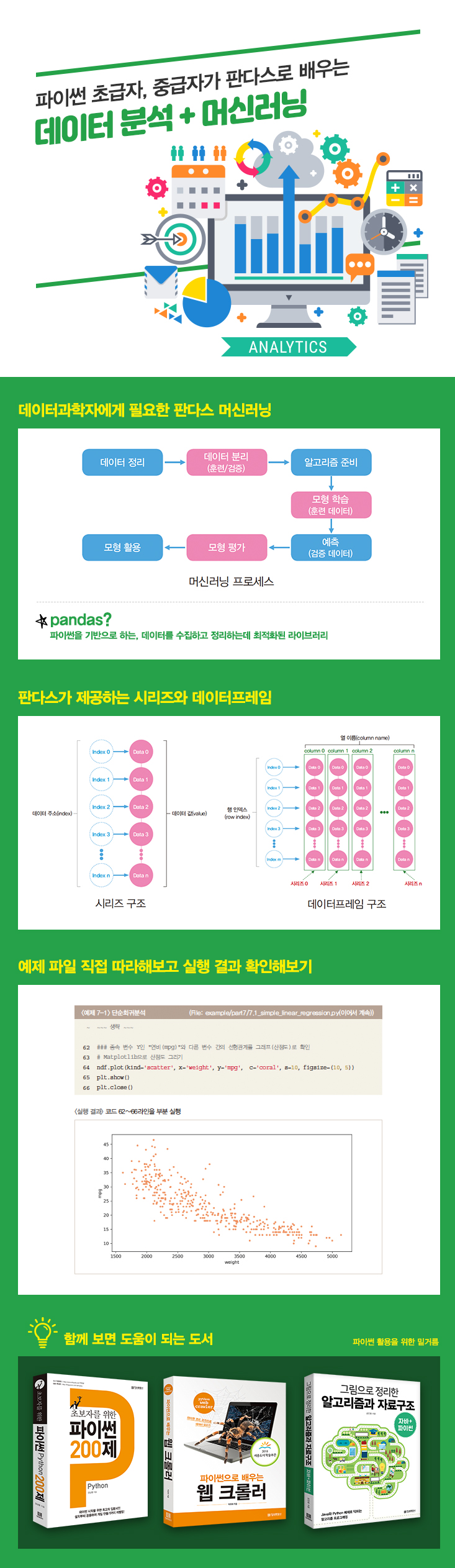 ÆÄÀ̽ã ÃʱÞÀÚ³ª Áß±ÞÀÚ°¡ µ¥ÀÌÅÍ ºÐ¼®°ú ¸Ó½Å·¯´×À» ¹è¿ì°íÀÚ ¸¶À½¸Ô¾ú´Ù¸é ÀÌ Ã¥À» ¼±ÅÃÇØ¾ß ÇÑ´Ù. Çʼö ¶óÀ̺귯¸®¸¦ ¼Ò°³ÇÏ°í ¼³Ä¡ºÎÅÍ ¿¹Á¦ Äڵ带 µû¶ó Çϸ鼭 ÀÚ¿¬½º·´°Ô Àͼ÷ÇØÁöµµ·Ï ¾È³»Çϰí Àֱ⠶§¹®ÀÌ´Ù. ¾î·Á¿ï °Í °°Àº ¼öÇаú Åë°èÇÐÀû ÀÌ·ÐÀº °¡´ÉÇÑ ÇÑ ³·Ãß°í ½Ç½ÀÇϸç ÃÖ¼ÒÇÑÀÇ ¼³¸íÀ¸·Î °á°ú°ª°ú È®ÀÎÇÒ ¼ö ÀÖµµ·Ï ÇÏ¿´´Ù. ¶ÇÇÑ ¹æ´ëÇÑ ÅØ½ºÆ®º¸´Ù´Â ´ÙÀ̾î±×·¥ µî°ú °°Àº µµ½ÄÈ­¿¡ ½Å°æÀ» ±â¿ï¿© ÇÑ´«¿¡ ÀÌÇØÇÒ ¼ö ÀÖµµ·Ï ±¸¼ºÇÏ¿´´Ù. ´©±¸³ª µ¥ÀÌÅÍ °úÇÐÀÚ°¡ µÉ ¼ö ÀÖ´Ù. ±× Ãâ¹ß ¼±»ó¿¡ ¼¹´Ù¸é ÀÌ Ã¥°ú ÇÔ²² ¿¹Á¦Äڵ带 Çϳª¾¿ ½ÇÇàÇØº¸¸é, ÆÄÀ̽㠵¥ÀÌÅÍ ºÐ¼®À» Áñ±â°í ÀÖ´Â º»ÀÎÀ» ¹ß°ßÇÒ °ÍÀÌ´Ù.