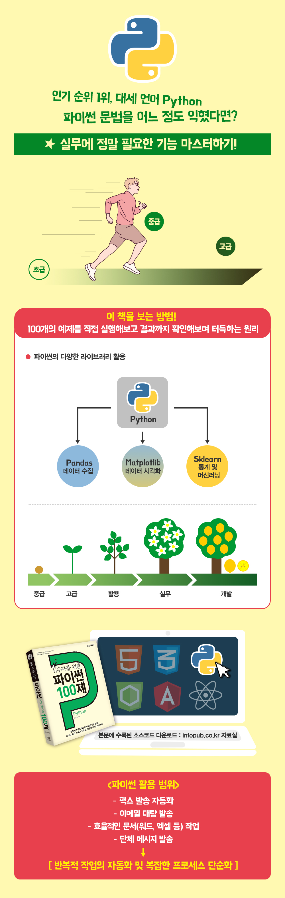 ÆÄÀ̽ãÀº ´õ ÀÌ»ó ÇÁ·Î±×·¡¹Ö Àü°øÀÚ¸¦ À§ÇÑ ¾ð¾î·Î¸¸ »ý°¢ÇÒ ¼ö ¾ø´Ù. ÃʵîÇб³ ÄÚµù ¼ö¾÷Àº ¹°·Ð ´ë±â¾÷ ÀÔ»ç ½ÃÇè¿¡¼µµ ÆÄÀ̽ã Ȱ¿ë ¿ª·®À» ÇÊ¿ä·Î Çϰí ÀÖ´Ù. ±×¸¸Å °£°áÇÑ ¹®¹ý°ú ÀÌÇØÇϱ⠽¬¿î ¾ð¾î·Î Àü ¼¼°èÀûÀ¸·Î ÁÖ¸ñ¹Þ°í ÀÖ´Â ¾ð¾îÀÓÀÌ ºÐ¸íÇÏ´Ù. ÆÄÀ̽ã Ç÷§ÆûÀº µ¶¸³ÀûÀÌ°í ´Ù¾çÇÏ°Ô »ç¿ëÇÒ ¼ö ÀÖ°í, ¶óÀ̺귯¸®µµ ¸Å¿ì ¸¹´Ù. °£°áÇÏ°í ½¬¿î ÀÌ ¾ð¾î¸¦ ¹è¿ì±â¿¡¼ ¸ØÃß´Â °ÍÀÌ ¾Æ´Ï¶ó ½Ç»ýȰ¿¡¼ Ȱ¿ëÇÒ ¼ö ÀÖµµ·Ï ¹è¿öº½À¸·Î½á ¹Ì·¡¸¦ °èȹÇÒ ¼ö ÀÖ´Ù. ÀÌ Ã¥Àº À¥ ½ºÅ©·¡ÇκÎÅÍ µ¥ÀÌÅÍ Á¤¸®¿Í ½Ã°¢È, ÀÏ»ó»ýȰ¿¡¼ÀÇ ¿ÀÇǽº ÀÚµ¿È, ¸¶Áö¸·À¸·Î ¾ÖÇø®ÄÉÀ̼ÇÀ» °³¹ßÇÏ´Â °úÁ¤±îÁö ¼Ò½º Äڵ带 Á¦°øÇϰí ÇнÀÀÚ°¡ Á÷Á¢ ½Ç½ÀÇØ º¼ ¼ö ÀÖµµ·Ï ±¸¼ºÇϰí ÀÖ´Ù. °á°ú°ª±îÁö È®ÀÎÇϸç ÀÚ½ÅÀÇ ½Ç·Â Çâ»óÀ» üũÇÒ ¼ö ÀÖÀ¸¹Ç·Î µ¶ÇÐÀ¸·Î ÆÄÀ̽ãÀ» °ÝÆÄÇÏ°í ½Í´Ù¸é ÈÄȸÇÏÁö ¾ÊÀ» ¼±ÅÃÀÌ´Ù.