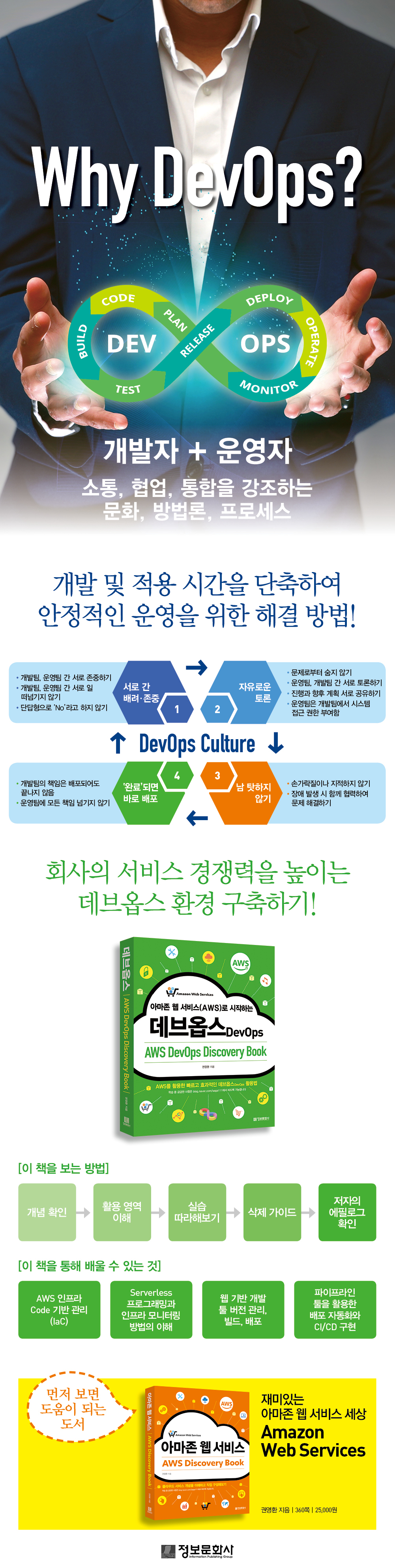 °³¹ß°ú ¿î¿µÀÌ µ¿½Ã¿¡ ÀÌ·ç¾îÁö´Â ÀǹÌÀÎ µ¥ºê¿É½º(DevOps)´Â ±âÁ¸ÀÇ °³¹ßÆÀ°ú ¿î¿µÆÀÀÇ ÈÇÕÀ» ÅëÇØ »ý»ê¼º°ú È¿À²¼ºÀ» ³ôÀ̱â À§ÇÑ ¹®È¶ó°í ÀÌÇØÇÒ ¼ö ÀÖ´Ù. IT ¹ßÀüÀÌ ÀÌ·ç¾îÁö¸ç ´õ ÀÌ»ó È¥ÀÚ ÀÏÇÏ´Â »çȸ°¡ ¾Æ´Ï±â ¶§¹®¿¡, ´ëºÎºÐÀÇ ±â¾÷¿¡¼´Â Ŭ¶ó¿ìµå¸¦ ÀÌ¿ëÇÑ Çù¾÷À» ¿ä±¸Çϰí ÀÖ´Â »óȲÀÌ´Ù. ±×·¯³ª Çö½ÇÀûÀ¸·Î ÀÌ·¸°Ô ´Ü¼øÇÑ ÀǹÌÀÎ ¼º°øÀûÀÎ IT ¼ºñ½ºÀÇ Çʼö Á¶°ÇÀÌ Àß ÁöÄÑÁöÁö ¸øÇϰí ÀÖ´Ù. ±×·¸±â ¶§¹®¿¡ ÀÌ Ã¥¿¡¼´Â µ¥ºê¿É½ºÀÇ ±âº»ÀûÀÎ ³»¿ëÀ» ÀÌÇØÇϰí Á÷Á¢ µû¶óÇØ º½À¸·Î½á ½ÇÁúÀû ¾÷¹«¿¡ Àû¿ë °¡´ÉÇϵµ·Ï ±¸¼ºÇÏ¿´´Ù. ¾Æ¸¶Á¸ À¥ ¼ºñ½º(AWS)¸¦ ±â¹ÝÀ¸·Î Çϰí Àֱ⠶§¹®¿¡ °ú±ÝÀÌ µÇ´Â ºÎºÐµµ Àִµ¥, ÀÌ´Â ¸Å éÅͰ¡ ³¡³¯ ¶§¸¶´Ù »èÁ¦ÇÏ´Â ¹æ¹ýÀ» ¾Ë·ÁÁÖ¾î ¸¶¹«¸®ÇÑ´Ù. ¶ÇÇÑ ÀúÀÚÀÇ °æÇè¿¡ ÀÇÇÑ ¿¡Çʷα׸¦ ÅëÇØ Á¶±Ý ´õ ½±°Ô ¹®È¸¦ ÀÌÇØÇÒ ¼ö ÀÖµµ·Ï ¾È³»Çϰí ÀÖ´Ù. ÀÌ´Â »õ·Î¿î ¹®È¸¦ ¹Þ¾ÆµéÀÌ´Â À̵鿡°Ô Á¶±Ý ´õ ½±°í Ä£ÀýÇÏ°Ô ÀúÀÚÀÇ °æÇèÀ» ¾Ë·ÁÁÖ±â À§ÇÑ ¼¶¼¼ÇÑ ¹è·Á¶ó°í º¼ ¼ö ÀÖ´Ù. ¾î·Æ°Ô¸¸ ´À²¸Áú ¼ö ÀÖ´Â IT ¿ë¾îµéÀ» ÀÏ»óÀÇ ¾ð¾î¸¦ ÅëÇØ ¸í·áÇÏ°Ô Àü´ÞÇϰí ÀÖ´Â °ÍÀÌ ÀÌ Ã¥ÀÇ °¡Àå Å« Ư¡À̶ó°í ¸»ÇÒ ¼ö ÀÖ´Ù.