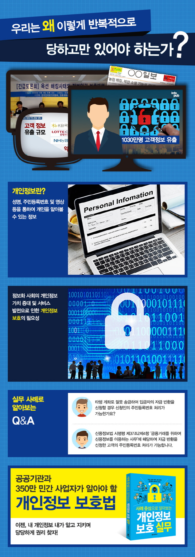 ¡¸°³ÀÎÁ¤º¸ º¸È£¹ý¡¹µµ ¹ý·üÀÎ ¸¸Å ÀÚÁÖ °øºÎÇÏ´Ù º¸¸é ¹ý·üÀû Áö½Äµµ °°ÀÌ »ó½ÂÇÔÀ» ¾Ë°Ô µÈ´Ù. ÇÊÀÚ´Â ½ÇÁ¦ ±×·± °æÇèÀÌ ´Ù¸¥ ¿µ¿ª¿¡¼ ¸¹ÀÌ µµ¿òÀÌ µÇ¾ú´Ù. ÀÌ Ã¥Àº ÀϹݹýÀÎ ¡¸°³ÀÎÁ¤º¸ º¸È£¹ý¡¹À» À§ÁÖ·Î ¾²¿´´Ù. ¡¸°³ÀÎÁ¤º¸ º¸È£¹ý¡¹Àº °³ÀÎÁ¤º¸¿¡ ´ëÇÑ ÀϹݹýÀÌ°í °ø°ø°ú ¹Î°£ºÐ¾ß¿¡ ³Î¸® Àû¿ëµÇ´Â ¹ýÀ̱⵵ ÇÏÁö¸¸ ¡¸Á¤º¸Åë½Å¸Á ÀÌ¿ëÃËÁø ¹× Á¤º¸º¸È£ µî¿¡ °üÇÑ ¹ý·ü¡¹À» °°ÀÌ ±â¼úÇϱ⿣ µ¶ÀÚµéÀÌ ´õ È¥¶õ½º·¯¿ö ÇÒ °Í °°¾Æ ÁÖ·Î ¡¸°³ÀÎÁ¤º¸ º¸È£¹ý¡¹ ±â¹ÝÀ¸·Î ¼¼úÇÏ°Ô µÇ¾ú´Ù. ¶ÇÇÑ ½Ç¹«ÀÚ ÀÎÅͺ並 ÅëÇÏ¿© °ø°ø±â°ü, ´ë±â¾÷, ±ÝÀ¶±â°ü, ¿£ÅÍÅ×ÀÎ¸ÕÆ®, Á¤º¸º¸¾È ÄÁ¼³ÅÏÆ® µî °³ÀÎÁ¤º¸ º¸È£¿¡ ´ëÇØ °°ÀÌ °í¹ÎÇÏ´Â »ý°¢À» Áö¸é¿¡ ±×´ë·Î ½Ç¾î º¸¾Ò´Ù.