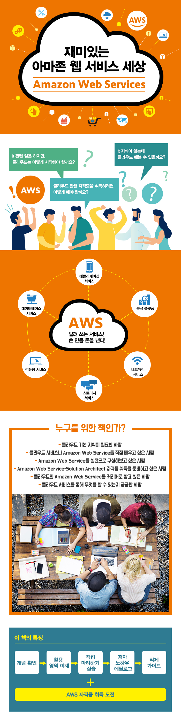 ÀÌ Ã¥Àº Ŭ¶ó¿ìµå¿Í Amazon Web Services¿¡ ´ëÇÑ Á¤ÀÇ¿Í °³³äÀ» ÀÌÇØÇÏ´Â °ÍºÎÅÍ ½ÃÀÛÇÑ´Ù. Àü¹ÝÀûÀ¸·Î ¼ºñ½º°¡ ¾î¶»°Ô ÁøÇàµÇ´ÂÁö ÀúÀÚÀÇ °æÇè°ú ½ÇÁúÀûÀ¸·Î »ç¿ëÇÏ´Â ±â¼ú¿¡ ´ëÇØ ÀÌÇØÇÏ°í ³ª¸é Á÷Á¢ ¸¸µé¾î º¼ ¼ö ÀÖ´Ù. Ã¥À» º¸¸ç µû¶óÇØ º¼ ¼ö ÀÖ´Â ±¸¼ºÀ¸·Î ¸¸µé¾îº¸°í °ú±Ý¿¡ ´ëÇØ¼´Â »èÁ¦ÇÏ´Â ±â´ÉÀÌ Ãß°¡µÈ´Ù. ±×·¸±â ¶§¹®¿¡ ÀÌ Ã¥À» ³¡³»´Â ¼ø°£ º»ÀÎÀÌ ¿øÇÏ´Â °÷¿¡ Ŭ¶ó¿ìµå¸¦ Àû¿ëÇÏ¿© Á÷Á¢ ½ÇÇàÇØ º¼ ¼ö ÀÖ°Ô µÈ´Ù. Ŭ¶ó¿ìµå³ª AWS¸¦ Á÷Á¢ ¹è¿ì°í ½Í´Ù¸é, ½ÇÁúÀûÀ¸·Î ±¸¼ºÇغ¸´Â ¿¹Á¦°¡ ±Ã±ÝÇÏ´Ù¸é, Ä¿¸®¾î¸¦ ½×±â À§ÇØ ±âº» Áö½ÄÀÌ ÇÊ¿äÇÏ´Ù¸é, Ȱ¿ë ¹æ¾ÈÀÌ ±Ã±ÝÇØ¼ È¥ÀÚ °øºÎÇØ º¸°í ½Í´Ù¸é ÀÌ Ã¥ÀÌ ±× ±Ã±ÝÁõÀ» ¸ðµÎ ÇØ°áÇØ ÁÙ °ÍÀÌ´Ù.