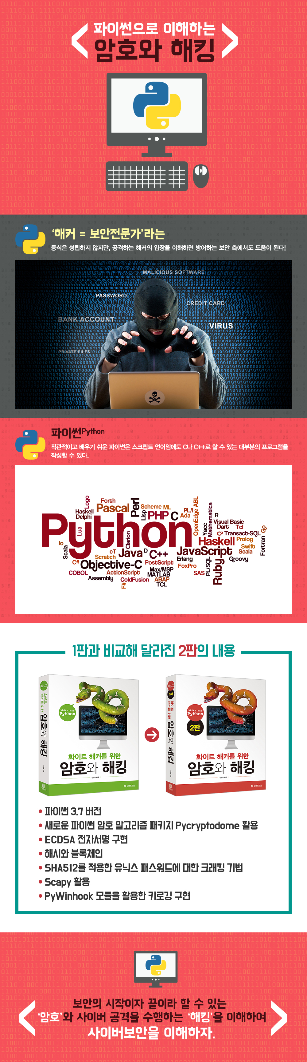 2016³â ÃÊÆÇ ¹ßÇà ÀÌÈÄ ²ÙÁØÇÏ°Ô »ç¶ûÀ» ¹Þ¾Æ¿Â ¡®¾ÏÈ£¿Í ÇØÅ·¡¯ÀÌ »õ·Î¿î ³»¿ë¿¡ ¸ÂÃß¾î °³Á¤ÆÇÀ¸·Î ³ª¿À°Ô µÇ¾ú´Ù. ÀÌ Ã¥¿¡¼­´Â 2019³â ±âÁØ ÃֽйöÀüÀÎ ÆÄÀ̽ã 3.7À» Àû¿ëÇϰí, ÀÌ¿Í °ü·ÃµÈ ÃֽжóÀ̺귯¸®¸¦ ¹Ý¿µÇÏ¿© À籸¼º µÇ¾úÀ¸¸ç, »õ·Î¿î ÆÄÀ̽㠾ÏÈ£ ¾Ë°í¸®Áò ÆÐŰÁöÀÎ PycryptodomeÀ» Ȱ¿ëÇÏ¿´´Ù. ¶ÇÇÑ ÇØ½Ã¿Í ºí·ÏüÀο¡ ´ëÇÑ ±¤¹üÀ§ÇÑ ±â¼úÀ» ¼Ò°³Çϰí ÀÖÀ¸¸ç ECDSA ÀüÀÚ¼­¸í ±¸ÇöÇϱⰡ Ãß°¡µÇ¾ú´Ù. º¸¾ÈÀÇ ½ÃÀÛÀÌÀÚ ³¡À̶ó°í ÇÒ ¼ö ÀÖ´Â ¾ÏÈ£¿Í, »çÀ̹ö °ø°ÝÀ» ¼öÇàÇÏ´Â ÇØÅ·À» ÀÌÇàÇÏ¿© »çÀ̹ö º¸¾È¿¡ ÀÀ¿ëÇϰíÀÚ ÇÏ´Â »ç¶÷µé¿¡°Ô Å« µµ¿òÀÌ µÉ °ÍÀÌ´Ù.