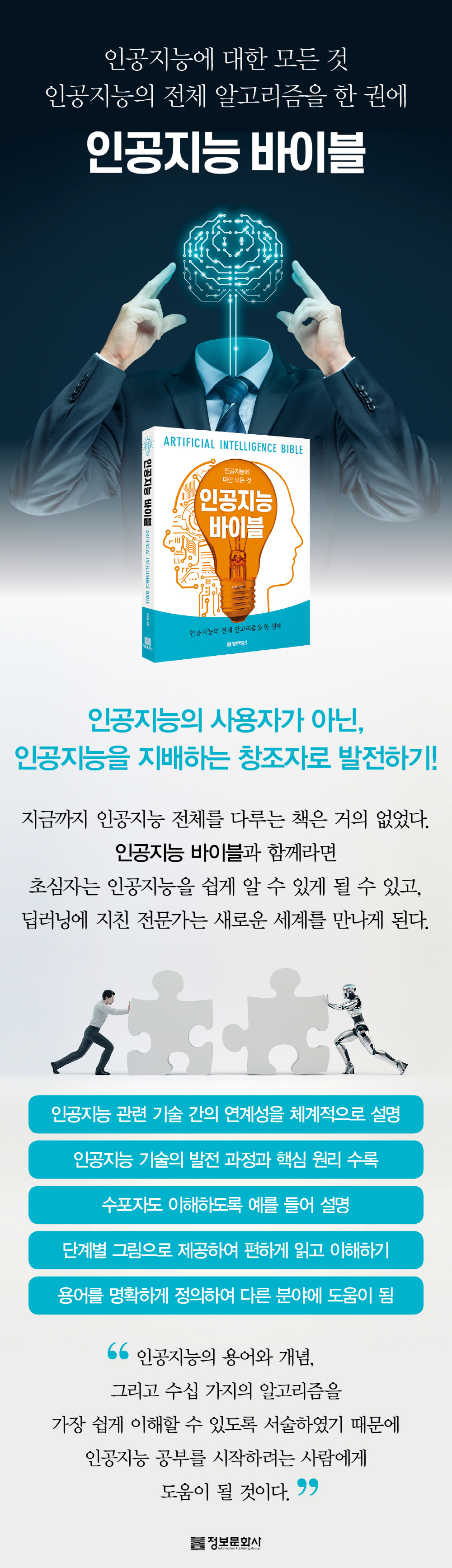 ÀΰøÁö´ÉÀº Àΰ£ÀÇ Áö´ÉÀ» ¸¸µé°í ½Í´Ù´Â ¿å±¸¿¡¼ ½ÃÀ۵Ǿî ÀÎÁö°úÇÐ, ·Îº¸Æ½½º, ¸Ó½Å·¯´×, ÃÖÀûÈ ÀÌ·Ð, ÆÐÅÏ ÀνÄ, ÀÚ¿¬¾î ó¸® µî ´Ù¾çÇÑ ºÐ¾ß¸¦ Æ÷ÇÔÇÑ´Ù. ÃÖ±Ù ÀÚÀ²ÁÖÇà, ±¤°í³ª ´º½ºÀÇ Ãßõ, ÀÚµ¿ ¹ø¿ª, ÀÇ·á Áö¿ø, ´ëÈÇü ÇÁ·Î±×·¥, ·Îº¿À» ÀÌ¿ëÇÑ »ý»ê ¹× ¼ºñ½º, ´ë±Ô¸ð µ¥ÀÌÅÍ ºÐ¼® ½Ã½ºÅÛ µî ´Ù¾çÇÑ ºÐ¾ß¿¡¼ Ȱ¿ëµÇ°í Àֱ⠶§¹®¿¡ ÇʼöÀûÀÎ Çй®À¸·Î ÀÚ¸® Àâ°í ÀÖ´Ù. ÀÌ Ã¥Àº ÀΰøÁö´É °³·Ð¼·Î ÃʽÉÀÚ¿¡°Ô ¸¹Àº °ÍµéÀ» Àç¹ÌÀÖ°Ô Àü´ÞÇÒ °ÍÀ̸ç, µö·¯´×¿¡ ÁöÄ£ Àü¹®°¡µé¿¡°Ô´Â »õ·Î¿î ¼¼°è¸¦ º¸¿©ÁÙ °ÍÀÌ´Ù. ƯÈ÷ ÀΰøÁö´ÉÀÇ °ÅÀÇ ¸ðµç ºÐ¾ß¸¦ ÀüüÀûÀ¸·Î ´Ù·ç°í Àֱ⠶§¹®¿¡ °ü·Ã ±â¼ú ¿¬°è¼º¿¡ ´ëÇÑ ·Îµå¸ÊÀ» Á¦½ÃÇÏ¿© Àüü¸¦ ¿¬°áÇϵµ·Ï ü°èÀûÀ¸·Î ¼³¸íÇÑ´Ù. ¶ÇÇÑ ¾î·Æ°Ô ´À³¥ ¼ö ÀÖ´Â ¼ö½ÄÀ̳ª ÇÁ·Î±×·¡¹ÖÀ» ÃÖ¼ÒÈÇÏ¿© °¡º±°í ÆíÇÏ°Ô Àаí ÀÌÇØÇÒ ¼ö ÀÖ´Ù. ±×¸®°í ´Ù¾çÇÑ ºÐ¾ß¿¡¼ »ç¿ëµÇ´Â ¸¹Àº »ý¼ÒÇÑ ¿ë¾î¸¦ ¸íÈ®ÇÏ°Ô Á¤ÀÇÇÏ°í »ç¿ëÇϱ⠶§¹®¿¡ ÀÌ Ã¥À» ¿Ïµ¶ÇÑ´Ù¸é ÇâÈÄ ´Ù¸¥ ºÐ¾ß¸¦ ÇнÀÇÒ ¶§ Å« µµ¿òÀÌ µÉ °ÍÀÌ´Ù.