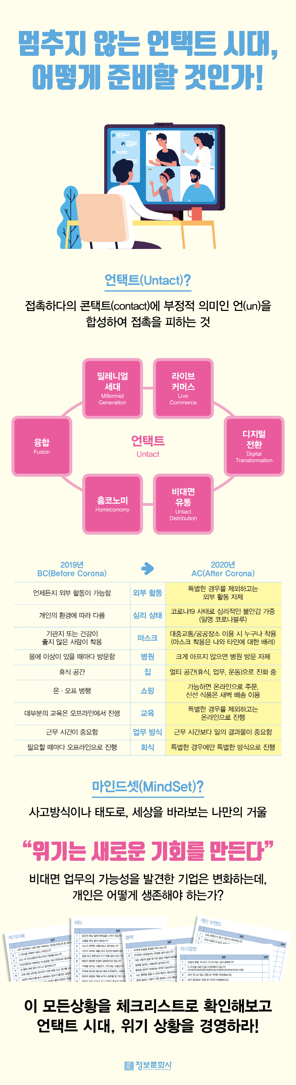 »ç¶÷°úÀÇ Á¢Ã˸¸À¸·Îµµ °¨¿°ÀÌ µÇ´Â Äڷγª ½Ã´ë°¡ ¹Ý³âÀÌ Áö³ª°¡°í ÀÖ´Ù. ±×¿Í ÇÔ²² »ç¶÷ »çÀÌÀÇ Á÷Á¢Àû Á¢ÃËÀ» ÃÖ¼ÒÈÇÏ´Â ¾ðÅÃÆ® ½Ã´ë°¡ ¿Â °ÍÀÌ´Ù. ÀÌ´Â ÀǽÄÁÖ´Â ¹°·ÐÀÌ°í ¶óÀÌÇÁ ½ºÅ¸Àϰú »îÀÇ ¹æ½ÄÀ» ¸Å¿ì ´Ù¾çÇÏ°Ô º¯È½ÃÄ×´Ù. ÀÌ·¸°Ô º¯ÈµÇ´Â ¼¼»ó¿¡¼ »ì¾Æ³²±â À§ÇØ ³ª´Â ¹«¾ùÀ» ÇØ¾ß ÇÒ±î? Àͼ÷Çß´ø °Íµé°ú °©ÀÛ½º·¯¿î À̺°, ±×¸®°í ³¸¼± °Í¿¡ ´ëÇÑ ÀûÀÀÀÌ °³ÀλӸ¸ ¾Æ´Ï¶ó Áö¿ª »çȸ¿Í °øµ¿Ã¼¸¦ ¸ðµÎ Èçµé¾î ³õ¾Ò´Ù. ±× È¥¶õ½º·¯¿ò ¼Ó¿¡¼ °³ÀÎÀÇ ¸¶Àεå¼ÂºÎÅÍ ±â¾÷ °æ¿µ Ȱµ¿±îÁö ´Ù¾çÇÑ ½ÃÇàÂø¿À¿Í Äڷγª ȯ°æ¿¡ ½½±â·Ó°Ô ´ëÀÀÇÏ´Â ¹æ¹ýÀ» ¾È³»Çϰí ÀÖ´Ù. ½±°Ô ³ª ÀÚ½ÅÀ¸·Î ½ÃÀÛÇØ À̽´°¡ µÇ°í ÀÖ´Â ´Ù¾çÇÑ Å°¿öµåµé±îÁö ¼Ò°³ÇÏ¸é¼ Á¶±Ý¾¿ ´Þ¶óÁ® °¡´Â ´ëÇѹα¹¿¡¼ °ú°Å¸¦ µó°í ¾ÕÀ¸·Î ³ª¾Æ°¡±â À§ÇÑ Áغñ¸¦ ÇÒ ¶§ÀÓÀ» º¸¿©ÁØ´Ù. ±×¸®°í °¢ ÆÄÆ®º° Æ÷ÇÔµÈ Ã¼Å©¸®½ºÆ®¸¦ Ȱ¿ëÇÏ¿© º»ÀÎÀÇ À§Ä¡³ª »óȲÀÌ ¾î´À Á¤µµÀÓÀ» Èï¹Ì·Ó°Ô È®ÀÎÇØ º¼ ¼ö ÀÖ´Ù.