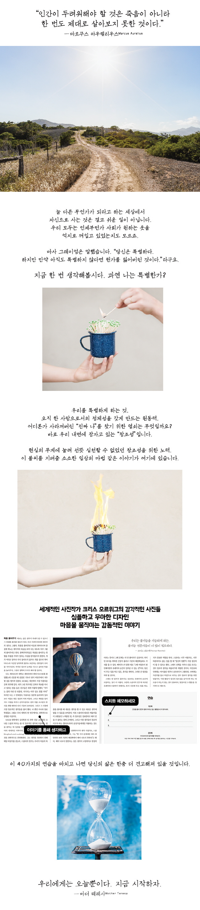 âÁ¶¼ºÀº ¸î¸î ¼±ÅùÞÀº »ç¶÷µéÀ» À§ÇÑ ¼±¹°ÀÌ ¾Æ´Ï¶ó ±× ºÒ²ÉÀ» »ì¸®·Á°í ³ë·ÂÇÏ´Â »ç¶÷ ¸ðµÎ¿¡°Ô ÁÖ¾îÁö´Â ÀھƽÇÇö°ú ¼ºÀåÀÇ °úÁ¤ÀÌ´Ù. ÀÌ Ã¥¿¡¼ Å©¸®½º ¿À¸£À§±×´Â âÁ¶Àû °úÁ¤¿¡ ´ëÇÑ ±×¸¸ÀÇ µ¶Æ¯ÇÑ °üÁ¡À» °¡Áö°í Á÷Á¢ °ÞÀº ´Ù¾çÇÑ ¿¡ÇǼҵå¿Í ½Ã´ë¸¦ ³Ñ³ªµå´Â À¯¸íÇÑ ÀÏȸ¦ ÅëÇØ ÀÏ¿¡¼ Àǹ̸¦ ¹ß°ßÇÏ´Â ¹ý, ¿µÈ¥À» °íÃë½ÃŰ°í ¿øÇß´ø »îÀ» »ç´Â ¹ýÀ» ¾Ë·ÁÁØ´Ù. ½Å±âÇϰԵµ Ã¥¿¡¼ ³ª¿À´Â ¸ðµç »ç»ó°ú °³³äÀº Á¶±Ýµµ µüµüÇÏÁö ¾Ê´Ù. °¢°¢ÀÇ À̾߱⸦ »ì¾Æ ¼û ½¬°Ô ÇÏ´Â °¨°¢ÀûÀÎ »çÁøµéÀÌ °¡µæÇϰí, °¢ À帶´Ù ¹è¿î °³³äµéÀ» »ýȰ¿¡¼ ½ÇÇàÇϸç üµæÇÒ ¼ö ÀÖ´Â 40°¡ÁöÀÇ ¿¬½ÀÀÌ µÞ¹ÞħµÇ¾î ÀÖ´Â ´öºÐÀÌ´Ù. ÀÌÁ¦ ¿ì¸®°¡ ÇÒ °ÍÀº ¿ì¸® »î¿¡ ÁøÂ¥ âÁ¶¼ºÀ» ±ú¿ì´Â °Í, ±×°Í¹Û¿¡ ¾ø´Ù!¡¡