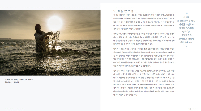 ÇÊÀÚ´Â ÀÌ Ã¥¿¡¼ ¡°ºñÀü¡±À̶ó´Â ´Ü¾î¸¦ °úµµÇÏ°Ô »ç¿ëÇÑ´Ù. ±× ´Ü¾î´Â ºÎÁ¦¿¡µµ ÀÖ°í, °¢ ÀåÀÇ Ç¥Á¦¿¡µµ ÀÖÀ¸¸ç, Ã¥ÀÇ º»¹®¿¡µµ ¼ö¾øÀÌ µîÀåÇÑ´Ù. ±×°ÍÀº ÇÊÀÚ°¡ °Ç¸ÁÁõÀÌ ÀÖ´Â °Íµµ ¾Æ´Ï°í, ÆíÁýÀÚ¸¦ ÇູÇÏ°Ô ¸¸µé±â À§ÇØ ±ÛÀ» ±æ°Ô ´ÃÀÌ·Á´Â ¸ñÀûµµ ¾Æ´Ï´Ù. ÀÌ Ã¥Àº »ç¶÷µé, Àå¼Òµé ±×¸®°í ¹®È¸¦ ´ã´Â °·ÄÇÑ »çÁø¿¡ ´ëÇÑ ³»¿ëÀ̱⠶§¹®¿¡ ±× ¼ÒÀçµéÀ» »çÁøÀ¸·Î Ç¥ÇöÇÏ·Á´Â ºñÀü°ú ¿å±¸°¡ ¾ø´Ù¸é ±×·± »çÁøÀ» ÃÔ¿µÇÒ ÀÌÀ¯°¡ ¾ø´Ù. ÇÊÀÚ´Â µ¶ÀÚµéÀÌ ÀÌ Ã¥¿¡¼ ¾ò´Â °ÍÀÌ Çϳª ÀÖ´Ù¸é, ±×°ÍÀÌ ¸íÈ®ÇÑ ±â¼úÀ» ÅëÇØ ÀÚ½ÅÀÇ ºñÀüÀ» ã°í Ç¥ÇöÇϰíÀÚ ÇÏ´Â »õ·Î¿î °áÀÇÀÌ±æ ¹Ù¶õ´Ù. ¶ÇÇÑ ÀÌ Ã¥ÀÌ ºñÀüÀ» ¸íÈ®È÷ Ç¥ÇöÇϱâ À§ÇÑ ±â¼úÀû µµ±¸µµ ¸î °¡Áö Á¦°øÇÏ±æ ¹Ù¶ó´Â ¸¶À½ÀÌ´Ù.