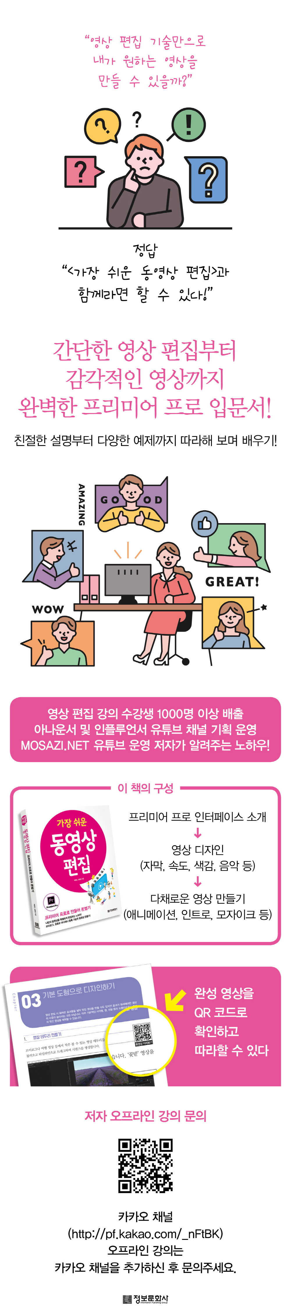 ÃÖ±Ù µ¿¿µ»ó ÆíÁýÀº ¸ðµÎ¿¡°Ô Æò¹üÇÑ ÀÏ»óÀÌ µÇ¾î ´Ù¾çÇÑ °ÀÇ¿Í µµ¼µéÀ» ½±°Ô ¸¸³ªº¼ ¼ö ÀÖ´Ù. ±×·¯³ª ÀÌ Ã¥Àº õ ¸í ÀÌ»óÀÇ ¼ö°»ýÀ» ¹èÃâÇÑ Çö¾÷ÀÇ °»ç°¡ Á÷Á¢ ¼³¸íÇϱ⠶§¹®¿¡ ½ÃÀÛÇÏ´Â »ç¶÷µéÀÇ ±Ã±ÝÁõÀ» ´©±¸º¸´Ù Àß ¾Ë°í ¼³¸íÇØ ÁÖ°í ÀÖ´Ù. ÇÁ¸®¹Ì¾î ÇÁ·Î ÇÁ·Î±×·¥À» ÀÌ¿ëÇÏ¿© µ¿¿µ»óÀ» ÆíÁýÇÏ°í ½Í´Ù¸é, ±×·¯³ª ³Ê¹« µÎ²¨¿î Ã¥Àº ºÎ´ã½º·´´Ù¸é ¹Ù·Î ÀÌ Ã¥ÀÌ °¥ÁõÀ» ÇØ¼ÒÇØ ÁÙ °ÍÀÌ´Ù. ±âÃÊÀûÀ¸·Î °¡Àå ¸¹ÀÌ »ç¿ëÇÏ´Â ±â´Éµé¸¸ »Ì¾Æ¼ Á÷Á¢ ½Ç½ÀÇØ º¼ ¼ö ÀÖÀ¸¸ç, ¿Ï¼º ¿µ»óÀ» QR Äڵ带 ÅëÇØ ¹Ì¸® È®ÀÎÇØº¼ ¼ö Àֱ⠶§¹®¿¡ ÇÁ·Î±×·¡¹Ö¿¡ ´ëÇÑ ¸·¿¬ÇÔ ¶ÇÇÑ »ç¶óÁø´Ù. Ã¥À» µû¶ó Çϱâ À§ÇÑ ¿¹Á¦´Â Á¤º¸¹®È»ç ȨÆäÀÌÁö(infopub.co.kr) ÀÚ·á½Ç¿¡¼ ´Ù¿î·Îµå °¡´ÉÇϸç, ÇнÀ Áß ±Ã±ÝÇÑ »çÇ×Àº ÀúÀÚ°¡ ¿î¿µÇÏ´Â ºí·Î±×(blog.naver.com/pineappleblind)¿¡¼ Çǵå¹éÇÒ ¼ö ÀÖ´Ù. ±×¸®°í ¿ÀÇÁ¶óÀÎ °ÀÇ(taling.me/Talent/Detail/6587)µµ ÁøÇàÇϰí ÀÖÀ¸¹Ç·Î µµ¼ ³»¿ë ÀÌ¿ÜÀÇ ±Ã±ÝÇÑ »çÇ×Àº ¼ö¾÷À¸·Î ÇØ°áÇÒ ¼ö ÀÖ´Ù. ƯÈ÷ µµ¼ ±¸¸ÅÀÚ¸¸ 1+1 ¼ö°±ÇÀÌ Áö±ÞµÇ±â ¶§¹®¿¡ Áö±Ý ´çÀå µ¿¿µ»ó ÆíÁýÀÌ ÇÊ¿äÇÏ´Ù¸é ¼±ÅÃÇØ¾ß ÇÒ µµ¼ÀÌ´Ù.