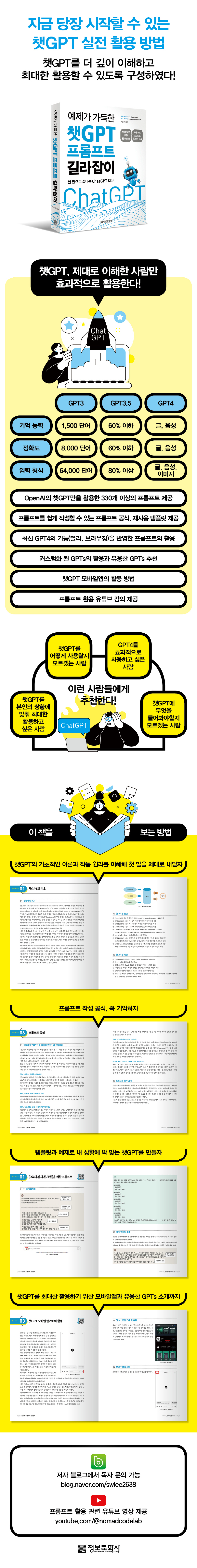 ¼ö¸¹Àº êGPT »ç¿ë ¾È³»¼ »çÀÌ¿¡¼ Áö±Ý È¥¶õ½º·¯¿î µ¶ÀÚµéÀ» À§ÇØ ¸¸µç Ã¥ÀÌ´Ù. êGPTÀÇ ±âÃÊ À̷кÎÅÍ ÇÙ½É »ç¿ë¹ýÀÎ ÇÁ·ÒÇÁÆ® ÀÛ¼º¹ý°ú GPT4ÀÇ ½Å±Ô ±â´É±îÁö, êGPT¸¦ ´Ü ÇÑ ±ÇÀ¸·Î ÃѸÁ¶óÇß´Ù. ´Ù¸¥ ¼ºñ½º¸¦ ÀÏü »ç¿ëÇÏÁö ¾Ê°í,, ¿ÀÁ÷ êGPT¿¡¸¸ ÁýÁßÇÏ¿© µ¶ÀÚÀÇ È°¿ëµµ¸¦ ±Ø´ëÈÇÑ´Ù. ±×¸®°í ½ÇÁ¦ »ýȰÀ̳ª ¾÷¹«¿¡¼ ¹Ù·Î ¾µ ¼ö ÀÖ´Â 330°³ ÀÌ»óÀÇ ´Ù¾çÇÑ ÇÁ·ÒÇÁÆ®¸¦ Á¦°øÇÑ´Ù. Á¦°øµÇ´Â ¿¹½Ã¹®Àº ÀÛ¼º ´Ü°è¸¦ ³ª´² µ¶ÀÚ°¡ »óȲ¿¡ ¸ÂÃç ÀÚÀ¯ÀÚÀç·Î º¯°æÇÒ ¼ö ÀÖµµ·Ï Çß´Ù. ¿¹½Ã¹®»Ó¸¸ ¾Æ´Ï¶ó, ÇÁ·ÒÇÁÆ®¸¦ ½±°Ô ÀÛ¼ºÇÒ ¼ö ÀÖ´Â °ø½Ä°ú ¾ðÁ¦µç Àç»ç¿ë °¡´ÉÇÑ ÅÛÇø´µµ Á¦°øÇÑ´Ù. ´õ ÁÁÀº Áú¹®À» º¸´Ù ½±°Ô ÀÛ¼ºÇϱâ À§ÇØ ÃªGPTÀÇ ±âÃÊÀûÀÎ ÀÌ·Ð ¹× ÀÛµ¿ ¿ø¸®¿Í »ç¿ë¹ýÀ¸·Î Ã¥À» ½ÃÀÛÇÑ´Ù. º»¹® Áß°£¿¡ »ðÀÔµÈ QRÄÚµå·Î À¯Æ©ºê °Àǵµ º¼ ¼ö ÀÖ¾î, êGPT¸¦ óÀ½ Á¢ÇÏ´Â »ç¿ëÀÚµµ ¾î·Á¿ò ¾øÀÌ µû¶ó¿Ã ¼ö ÀÖ°Ô Çß´Ù. ¿ëµµº°, ºÐ¾ßº°·Î ³ª´² Á¦°øÇϴ dzºÎÇÑ ÇÁ·ÒÇÁÆ®¿¡ ´õºÒ¾î êGPT ¸ð¹ÙÀϾÛ, À¯¿ëÇÑ GPTs, ÃֽŠGPT4ÀÇ ±â´ÉÀ» ¹Ý¿µÇÑ È°¿ë¹ý±îÁö Á¦¾ÈÇϱ⠶§¹®¿¡ ÀÌ¹Ì ÀÏÁ¤ ¼öÁرîÁö »ç¿ëÇØ º» °æÇèÀÌ ÀÖ´Â »ç¿ëÀÚ¿¡°Ôµµ µµ¿òÀÌ µÉ ¡®ÃªGPT ±æ¶óÀâÀÌ¡¯ÀÌ´Ù.
