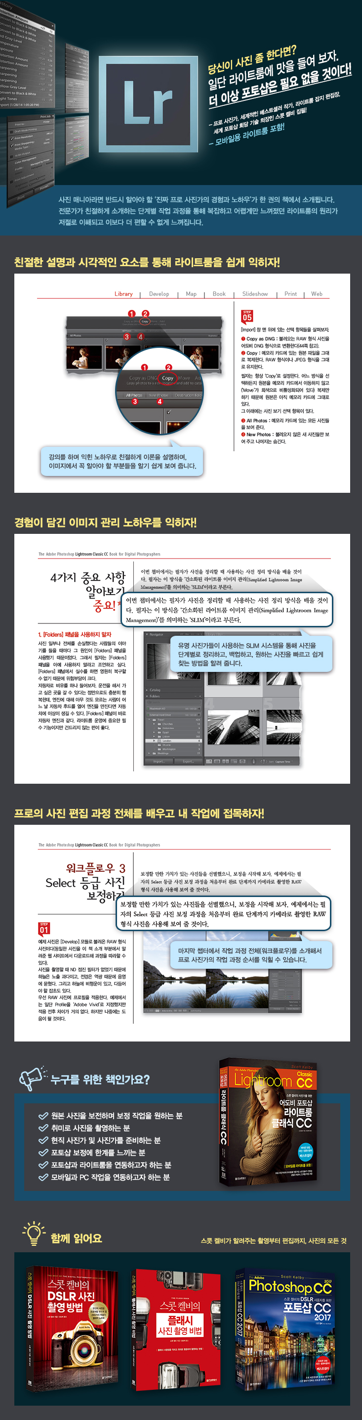 Ä£ÀýÇÑ ¼³¸í°ú ½Ã°¢ÀûÀÎ ¿ä¼Ò¸¦ ÅëÇØ ¾î·Á¿ï ¼ö ÀÖ´Â ¶óÀÌÆ®·ëÀ» ½±°Ô ÀÍÈú ¼ö ÀÖ½À´Ï´Ù! ¶óÀÌÆ®·ëÀº Æ÷Åä¼¥º¸´Ù Àü¹®ÀûÀÎ ÇÁ·Î±×·¥À¸·Î ÀÎ½ÄµÇ¾î ¾î·Æ°Ô ´À²¸Áú ¼ö ÀÖÁö¸¸, ½±°Ô ÀÍÈú ¼ö ÀÖµµ·Ï Ä£ÀýÇÏ°Ô ¼³¸íÇÏ¿´°í ½Ã°¢ÀûÀÎ ¹æ¹ýÀ¸·Î Á¤¸®ÇÏ¿© ÀúÀÚÀÇ °³ÀÎ °ú¿Ü¸¦ ¿·¿¡¼ ¹Þ´Â µíÇÑ ´À³¦À» ¹ÞÀ» ¼ö ÀÖ½À´Ï´Ù. ±âÁ¸ ¶óÀÌÆ®·ë ±â´É»Ó¸¸ ¾Æ´Ï¶ó ¶óÀÌÆ®·ë Ŭ·¡½Ä CC¿¡ »õ·Î Ãß°¡µÈ RAW Ä«¸Þ¶ó, Èæ¹é ÇÁ·ÎÇÊ µîÀ» ½Ç¾î ±âÃʸ¦ źźÈ÷ ½×À¸¸ç ¶óÀÌÆ®·ëÀÇ ¸ðµç °ÍÀ» ÀÍÈú ¼ö ÀÖ½À´Ï´Ù. °æÇèÀÌ ´ã±ä À̹ÌÁö °ü¸® ³ëÇϿ츦 °ø°³ÇÕ´Ï´Ù! ¶óÀÌÆ®·ëÀº À̹ÌÁö º¸Á¤»Ó¸¸ ¾Æ´Ï¶ó À̹ÌÁö °ü¸®¿¡ Æ¯ÈµÈ ÇÁ·Î±×·¥ÀÔ´Ï´Ù. ÀúÀÚ°¡ °³¹ßÇÑ SLIM(°£¼ÒÈµÈ ¶óÀÌÆ®·ë À̹ÌÁö °ü¸®) ½Ã½ºÅÛÀ» °ø°³ÇÏ¿© »çÁøÀ» ´õ ½±°Ô Á¤¸®Çϰí, ¹é¾÷Çϰí, ºü¸£°Ô ãÀ» ¼ö ÀÖ´Â ³ëÇϿ츦 ¾òÀ» ¼ö ÀÖ½À´Ï´Ù. ¾Æ¸§´Ù¿î »çÁø¿¡ ´ëÇÑ °¨°¢Àº ´ýÀ¸·Î ¾ò¾î °¡¼¼¿ä. ÇÁ·Î »çÁø°¡ÀÇ »çÁø ÆíÁý °úÁ¤ Àüü¸¦ ¹è¿ì°í ÀÚ½ÅÀÇ ÀÛ¾÷¿¡ Á¢¸ñÇÒ ¼ö ÀÖ½À´Ï´Ù! »çÁø ÆíÁý °úÁ¤ Àüü¸¦ ¸í·áÇÏ°Ô Á¤¸®ÇÏ¿©, óÀ½ºÎÅÍ ³¡±îÁö ¼ø¼´ë·Î ¹è¿ï ¼ö ÀÖÀ¸¸ç, ÀÌ Ã¥ÀÇ ¿¹Á¦·Î »ç¿ëÇÑ »çÁø ´ëºÎºÐÀ» Á¤º¸¹®È»ç ȨÆäÀÌÁö ¶Ç´Â ÀúÀÚÀÇ À¥ ÆäÀÌÁö¿¡¼ ´Ù¿î·ÎµåÇÏ¿© º¸Á¤ ¹× ÆíÁý °úÁ¤À» ±×´ë·Î µû¶óÇØ º¼ ¼ö ÀÖ½À´Ï´Ù. ¸¶Áö¸· éÅÍ¿¡¼ ÀÛ¾÷ °úÁ¤ Àüü¸¦ Á¤¸®ÇÏ¿© ¼ø¼¸¦ È®½ÇÈ÷ ÀÍÈ÷°í ½º½º·Î µ¶ÀÚÀÇ ÀÛ¾÷¿¡ Á¢¸ñÇÒ ¼ö ÀÖµµ·Ï ÇÏ¿´½À´Ï´Ù.