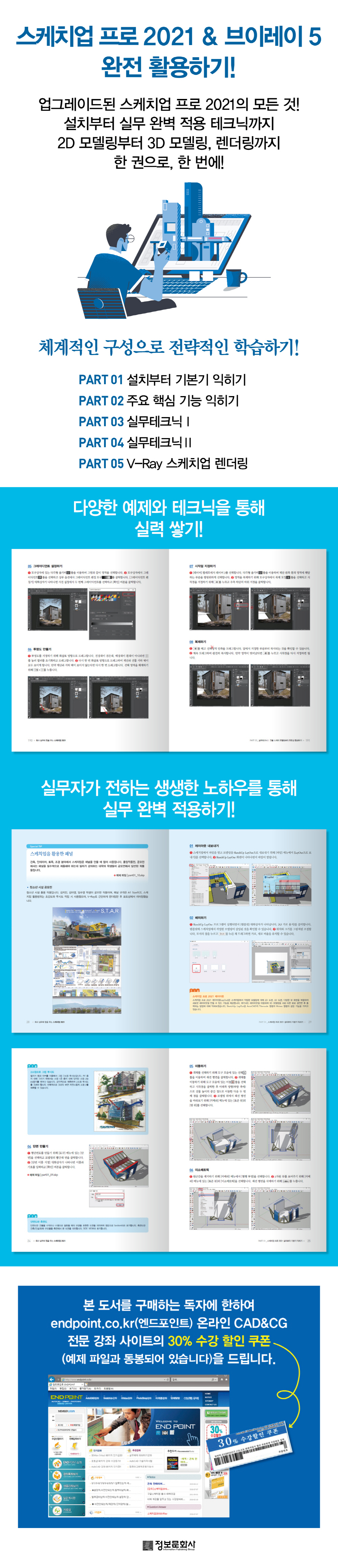 ½ºÄÉÄ¡¾÷ ÇÁ·Î(SketchUp Pro) 2021Àº Àü¹®°¡¸¦ À§ÇÑ 3D ¸ðµ¨¸µ ¼Ö·ç¼ÇÀ¸·Î, µðÀÚÀÌ³Ê¿Í ¼³°èÀÚµéÀ» À§ÇÑ ÃÖÀûÀÇ ±×·¡ÇÈ ÇÁ·Î±×·¥ÀÌ´Ù. »ç¿ëÀÚ°¡ ´õ ÆíÇϰÔ, ´õ °¨°¢ÀûÀ¸·Î »ç¿ëÇÒ ¼ö ÀÖµµ·Ï ¾÷±×·¹À̵åµÈ 2021 ¹öÀüÀ¸·Î µ¹¾Æ¿Ô´Ù. ÀÌ Ã¥Àº ½ºÄÉÄ¡¾÷ ÇÁ·Î 2021ÀÇ ¼³Ä¡ºÎÅÍ 3D ¸ðµ¨¸µ Á¦ÀÛ¿¡ ÇÊ¿äÇÑ ÇÙ½É ±â´É, °Ç¹° ½ºÄÉÄ¡ ¸ðµ¨¸µºÎÅÍ Æ÷Åä¼¥ ÇÕ¼ºÇϱâ, À¥Å÷°ú ÀÎÅ׸®¾î ¸ðµ¨¸µ, Ư¼ö ±â´É Ȱ¿ë, ½ºÄÉÄ¡¾÷ ¿ÜºÎ ÇÁ·Î±×·¥ÀÎ V-Ray ·»´õ¸µ±îÁö °ñ°í·ç ´Ù·ç°í ÀÖ´Ù. °ÇÃà µðÀÚÀ̳Ê, ÀÎÅ׸®¾î µðÀÚÀ̳Ê, Á¦Ç° µðÀÚÀ̳Ê, Åä¸ñ µðÀÚÀ̳Ê, »ê¾÷ µðÀÚÀÎ Á¾»çÀÚ, ȯ°æ µðÀÚÀÎ, °ø°ø µðÀÚÀÎ, ±â°è, ÀüÀÚ µî ´Ù¾çÇÑ ºÐ¾ß Á¾»çÀÚµéÀÇ È¸»ç ½Ç¹«¿¡ ÈûÀ» ½Ç¾îÁÙ ¾È³»¼ÀÌ´Ù. ½ºÄÉÄ¡¾÷ÀÇ ±âº»ÀûÀÎ ±â´É ÆÄ¾ÇºÎÅÍ Â÷±ÙÂ÷±Ù ÀÍÈ÷µµ·Ï ±¸¼ºµÇ¾î źźÇÏ°Ô ½Ç·ÂÀ» ½×À» ¼ö ÀÖ´Â ¹ßÆÇÀ» Á¦°øÇÑ´Ù. ´Ü°èÀûÀ¸·Î ±¸¼ºµÇ¾î Àֱ⠶§¹®¿¡ ÈĹݺηΠ°¥¼ö·Ï ¾î·Á¿ò¿¡ ºÀÂøÇÒ ¼ö ÀÖÁö¸¸, ÀÌ Ã¥À» ³¡±îÁö µû¶ó°£´Ù¸é ¾î´À»õ ½ºÄÉÄ¡¾÷ ÇÁ·Î 2021À» ´Ù·ç´Â ±â¼úÀÌ Çâ»óµÇ¾î ÀÖÀ½À» ±ú´ÞÀ» ¼ö ÀÖÀ» °ÍÀÌ´Ù.