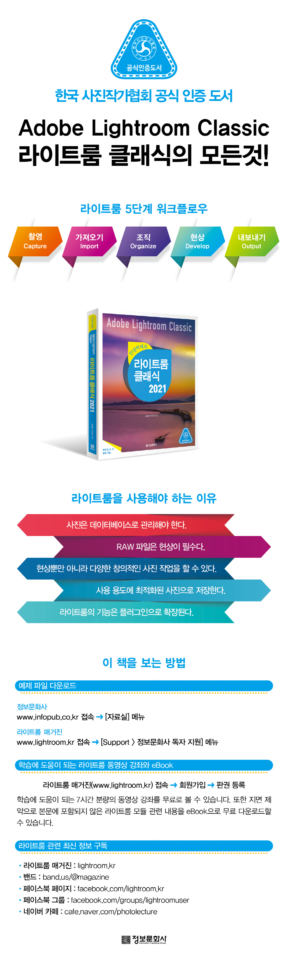 ÀÌ Ã¥Àº ¶óÀÌÆ®·ëÀ̶ó´Â ÇÁ·Î±×·¥ÀÌ °¡Áö°í Àִ Ư¼º°ú ±âº» Áö½ÄºÎÅÍ ¼³Ä¡¿Í Ȱ¿ë±îÁö ÇÑ ±ÇÀ¸·Î ¹è¿ï ¼ö ÀÖµµ·Ï ±¸¼ºµÇ¾î ÀÖ´Ù. Ãʺ¸ÀÚ¸¦ À§ÇÑ ÀÔ¹®¼­·Î ÃÑ ´Ù¼¸ °³ÀÇ ÆÄÆ®·Î ÀÌ·ç¾îÁ® ÀÖ´Ù. ÆÄÆ® 1 ¡®¶óÀÌÆ®·ë °³¿ä¡¯¿¡¼­´Â Æ÷Åä¼¥°ú´Â ´Ù¸¥ ¶óÀÌÆ®·ë¸¸ÀÇ Æ¯Â¡À» ¼³¸íÇϰí, ¶óÀÌÆ®·ëÀÇ ¼³Ä¡¿Í ±âº» ȯ°æ ¼³Á¤, ÀÎÅÍÆäÀ̽º ±¸¼ºÀ» »ìÆìº»´Ù. ÆÄÆ® 2 ¡®»çÁø °¡Á®¿À±â¡¯¿¡¼­´Â īŻ·Î±×¿Í »çÁø °¡Á®¿À±â¿¡ ´ëÇÑ °³³äÀ» ÀÌÇØÇϰí, īŻ·Î±×ÀÇ »ý¼ººÎÅÍ µî·ÏµÈ »çÁøÀ» °ü¸®ÇÏ´Â ¹æ¹ýÀ» ¾Ë¾Æº»´Ù. ÆÄÆ® 3 ¡®»çÁø °ü¸®Çϱ⡯¿¡¼­´Â »çÁøÀ» º¸´Â ´Ù¾çÇÑ ¹æ¹ý°ú ¿©·¯ °¡Áö Á¤º¸ ¹× »çÁøÀ» ºÐ·ùÇÏ´Â ¹æ¹ý µî¿¡ ´ëÇØ ¹è¿î´Ù. ÆÄÆ® 4 ¡®µðÁöÅÐ Çö»óÇϱ⡯¿¡¼­´Â À̹ÌÁö ÇÁ·Î¼¼½º¿Í ÇÁ·ÎÆÄÀÏ, ±¸µµÀÇ º¸Á¤, È­ÀÌÆ® ¹ë·±½ºÀÇ ±³Á¤, Åæ º¸Á¤, »ö º¸Á¤ µî ¶óÀÌÆ®·ëÀÇ È°¿ëÀ» ¾È³»ÇÑ´Ù. ¸¶Áö¸· ÆÄÆ® 5 ¡®³»º¸³»±â¡¯¿¡¼­´Â ¶óÀÌÆ®·ë¿¡¼­ Çö»óÇÑ »çÁøÀ» º°µµÀÇ ÆÄÀÏ·Î ÀúÀåÇÏ´Â ¿©·¯ ¹æ¹ý¿¡ ´ëÇØ ´Ù·é´Ù. ÀúÀÚÀÇ ²Ä²ÄÇÏ°í ¼¼¼¼ÇÑ ¼³¸íÀ» ÅëÇØ ¶óÀÌÆ®·ë ÀÔ¹®ÀÚµµ óÀ½ºÎÅÍ ³¡±îÁö ¸ðµç °úÁ¤À» µû¶ó¿À±â ¼ö¿ùÇÏ°Ô ¸¸µé¾îÁ³´Ù. ÀÌ Ã¥À» ¸¶½ºÅÍÇÑ´Ù¸é ¶óÀÌÆ®·ëÀ» ´Ù·ç´Â ½Ç·Â Çâ»óÀº ¹°·Ð »çÁø¿¡ ´ëÇÑ ÀÌÇØ ¿ª½Ã ³ôÀº ¼öÁØÀ» °¡Áú ¼ö ÀÖ°Ô µÉ °ÍÀÌ´Ù.