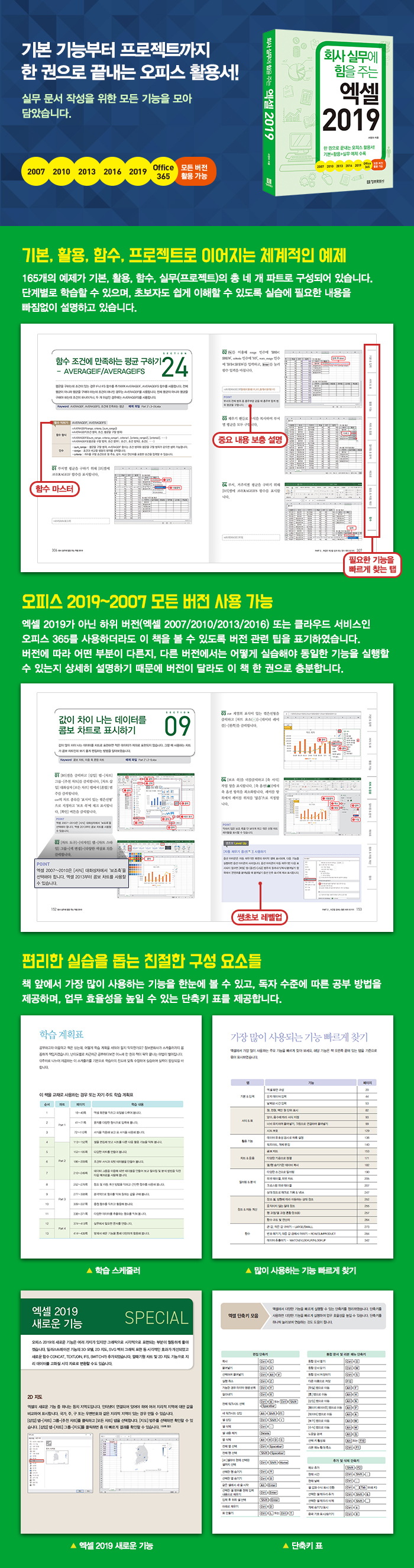 Ã¥ ¾Õ¿¡¼­ Á¦°øÇÏ´Â <°¡Àå ¸¹ÀÌ »ç¿ëµÇ´Â ±â´É ºü¸£°Ô ã±â> Ç¥¸¦ ÅëÇØ ¸¹ÀÌ »ç¿ëÇÏ´Â ±â´ÉÀ» ÇÑ´«¿¡ º¼ ¼ö ÀÖÀ¸¸ç, 13ÁÖÂ÷·Î ³ª´©¾î Á¦°øÇÏ´Â ½ºÄÉÁÙ·¯ÀÎ <ÇнÀ °èȹǥ>¸¦ ÅëÇØ ±³Àç·Î »ç¿ëÇϰųª ½º½º·Î ÇнÀÇÒ ¶§ µµ¿òÀ» ¾òÀ» ¼ö ÀÖ½À´Ï´Ù. µ¶ÀÚ ¼öÁØ¿¡ µû¸¥ °øºÎ ¹æ¹ýÀ» Á¦°øÇϸç Ã¥ µÚ¿¡´Â ¿¢¼¿ 2019ÀÇ »õ·Î¿î ±â´ÉÀ» ¸ð¾Æ ½Ç¾ú°í, ´Ù¾çÇÑ ±â´ÉÀ» ºü¸£°Ô ½ÇÇàÇÏ¿© ¾÷¹« È¿À²¼ºÀ» ³ôÀÏ ¼ö ÀÖ´Â ´ÜÃàŰ Ç¥¸¦ Á¦°øÇÕ´Ï´Ù.