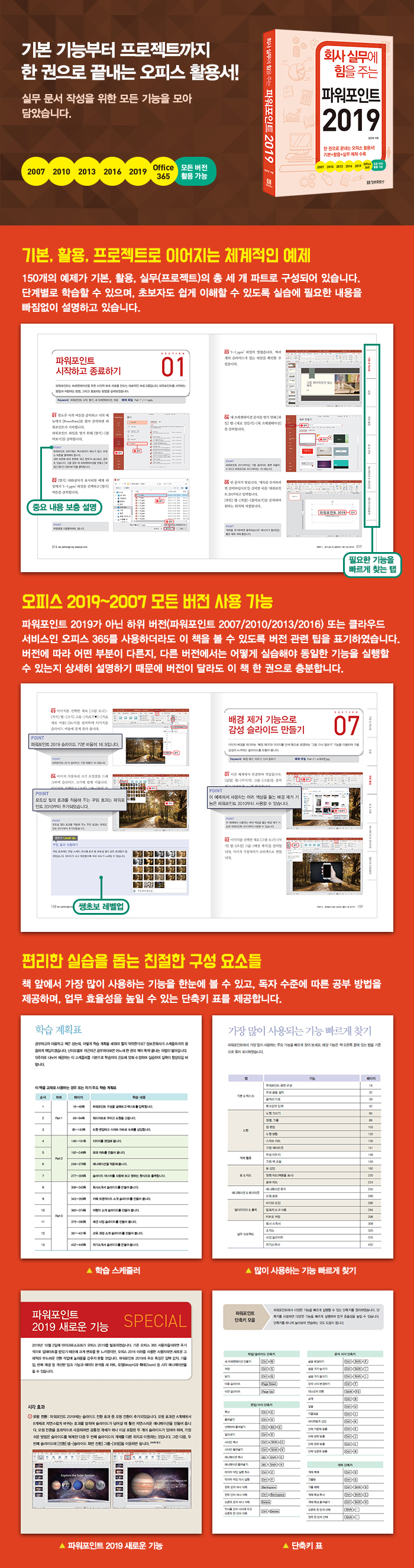 Ã¥ ¾Õ¿¡¼ Á¦°øÇÏ´Â <°¡Àå ¸¹ÀÌ »ç¿ëµÇ´Â ±â´É ºü¸£°Ô ã±â> Ç¥¸¦ ÅëÇØ ¸¹ÀÌ »ç¿ëÇÏ´Â ±â´ÉÀ» ÇÑ´«¿¡ º¼ ¼ö ÀÖÀ¸¸ç, 13ÁÖÂ÷·Î ³ª´©¾î Á¦°øÇÏ´Â ½ºÄÉÁÙ·¯ÀÎ <ÇнÀ °èȹǥ>¸¦ ÅëÇØ ±³Àç·Î »ç¿ëÇϰųª ½º½º·Î ÇнÀÇÒ ¶§ µµ¿òÀ» ¾òÀ» ¼ö ÀÖ½À´Ï´Ù. µ¶ÀÚ ¼öÁØ¿¡ µû¸¥ °øºÎ ¹æ¹ýÀ» Á¦°øÇϸç Ã¥ µÚ¿¡´Â ÆÄ¿öÆ÷ÀÎÆ® 2019ÀÇ »õ·Î¿î ±â´ÉÀ» ¸ð¾Æ ½Ç¾ú°í, ´Ù¾çÇÑ ±â´ÉÀ» ºü¸£°Ô ½ÇÇàÇÏ¿© ¾÷¹« È¿À²¼ºÀ» ³ôÀÏ ¼ö ÀÖ´Â ´ÜÃàŰ Ç¥¸¦ Á¦°øÇÕ´Ï´Ù.