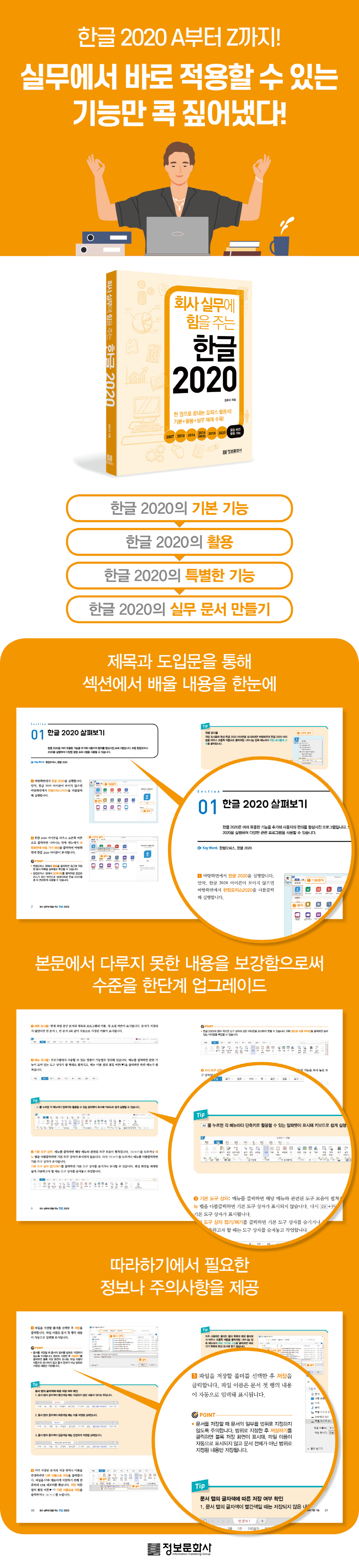 ²ÙÁØÇÏ°Ô »ç¶û¹Þ´Â ¡®È¸»ç ½Ç¹«¿¡ ÈûÀ» Áִ¡¯ ½Ã¸®Áî¿¡ ÃÖ½ÅÆÇ ¡®ÇÑ±Û 2020¡¯ÀÌ Ãß°¡µÇ¾ú´Ù. °ø°ø ±â°üÀ̳ª Çб³, ±â¾÷¿¡¼­ ¸¹ÀÌ »ç¿ëµÇ´Â ÇÑ±Û ÇÁ·Î±×·¥Àº »ç¿ë ºóµµ¿¡ ºñÇØ ½¬¿î ±â´ÉÀ» ÀÎÁöÇÏÁö ¸øÇÏ´Â »ç¶÷µéÀÌ ¸¹´Ù. ÀÌ Ã¥Àº ´Ù³â°£ °­ÀǸ¦ ÅëÇØ µ¶ÀÚµéÀÇ ±Ã±ÝÁõÀ» ÇØ°áÇØ¿Â ÀúÀÚ°¡ ¾î¶² ºÎºÐÀ» ¾î·Á¿öÇÏ°í ¾î¶² ±â´ÉÀÌ ½Ç¹«¿¡ ¹Ù·Î Àû¿ëµÇ´ÂÁö °í¹ÎÇÏ¿© ¸¸µé¾îÁ³´Ù. ƯÈ÷ µû¶ó Çϱ⠽¬¿î ¿¹Á¦µé·Î ±¸¼ºµÇ¾î Àֱ⠶§¹®¿¡ ÀÚÁÖ »ç¿ëµÇ´Â ±â´ÉÀ» ÈξÀ »¡¸® ÀÍÈú ¼ö ÀÖ´Ù´Â ÀåÁ¡ÀÌ ÀÖ´Ù. ±×¸®°í ÀÌ Ã¥Àº ÇÑ±Û 2007, 2010, 2014, 2016(NEO), 2018, 2020 ¸ðµç ¹öÀü¿¡¼­ Ȱ¿ë °¡´ÉÇÏ´Ù. º»¹®¿¡ Ȱ¿ëµÈ ¿¹Á¦ ÆÄÀÏÀº Á¤º¸¹®È­»ç ȨÆäÀÌÁö(infopub.co.kr) ÀÚ·á½Ç¿¡¼­ ´Ù¿î·Îµå °¡´ÉÇϸç, ÇнÀÇÏ´Ù ¾î·Á¿î Á¡Àº ¡®·Î»ç½ÜÀÇ Äı³½Ç¡¯ ºí·Î±×(blog.naver.com/happynut)¿¡¼­ Çǵå¹é °¡´ÉÇÏ´Ù.