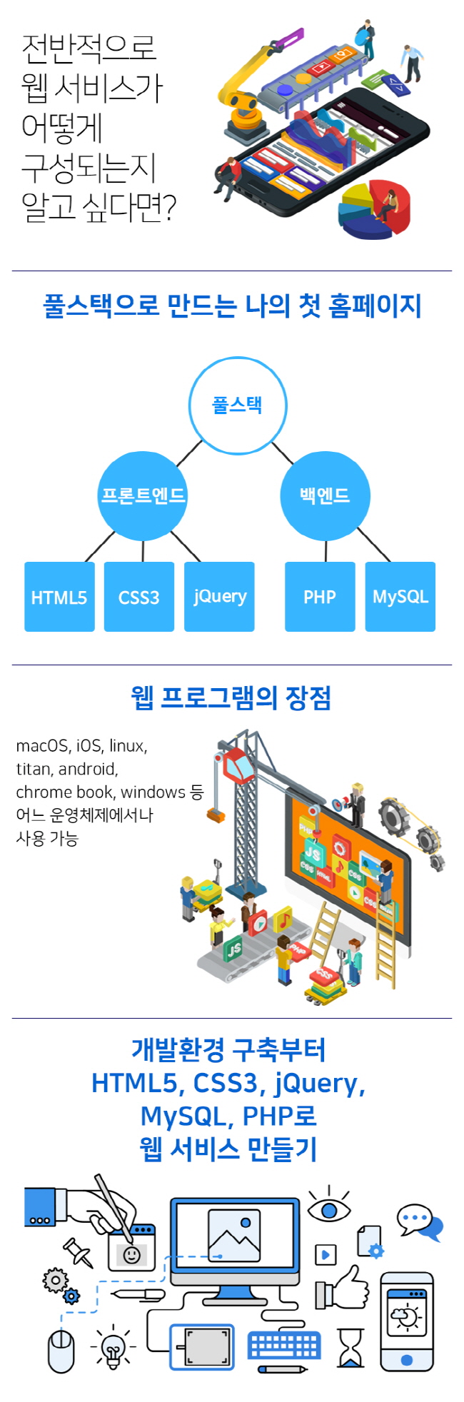 ÀÌ Ã¥Àº °³¹ß ȯ°æ ±¸Ãà ÀÌÈÄ HTML5, CSS3, jQuery ¼øÀ¸·Î ÇнÀÇÑ ÈÄ ÇÁ·ÎÁ§Æ®·Î ÇÁ·ÐÆ®¿£µå ºÎºÐÀ» ¸¸µé°í, MySQL°ú PHP¸¦ ÇнÀÇÏ¿© ¹é¿£µå ºÎºÐÀ» ¸¸µé¾î ÇÁ·ÎÁ§Æ®¸¦ ¿Ï¼ºÇÏ´Â °úÁ¤ÀÌ´Ù. ¾Æ¹«°Íµµ ¸ð¸£´õ¶óµµ ÄÄÇ»Å͸¸ ÀÖ´Ù¸é À¥ ¼­ºñ½º°¡ Àü¹ÝÀûÀ¸·Î ¾î¶»°Ô ±¸¼ºµÇ´ÂÁö ¾Ë ¼ö ÀÖ°Ô µÈ´Ù.