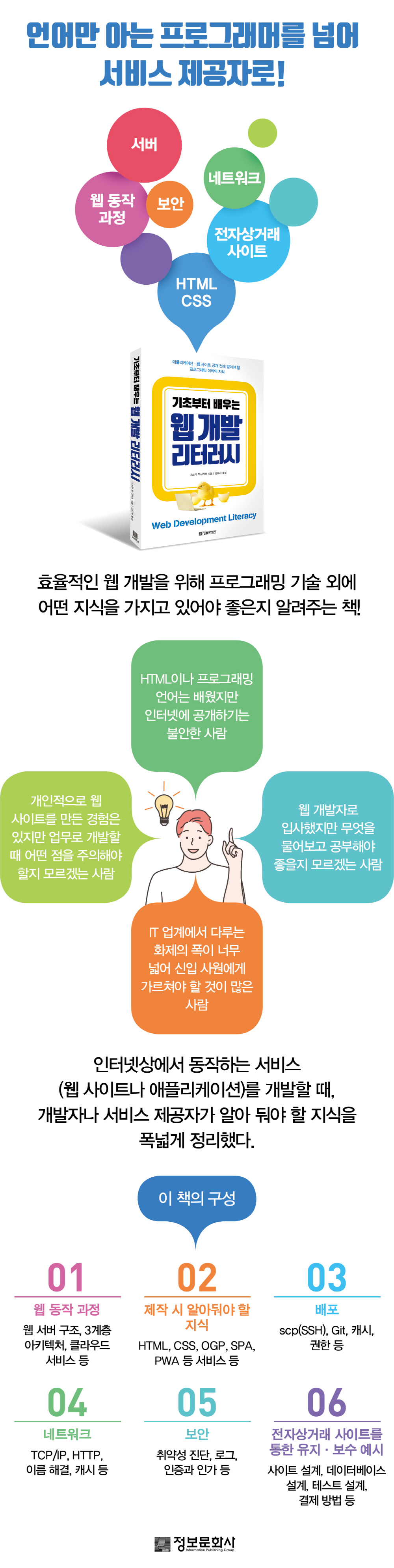 ÀÌ Ã¥Àº È¿°úÀûÀÎ ÇнÀÀ» À§ÇØ À¥ »çÀÌÆ®¸¦ Á¦ÀÛÇÏ°í °ø°³ÇÏ´Â ¼ø¼·Î ÁøÇàµÈ´Ù. À¥ÀÇ µ¿ÀÛ °úÁ¤ºÎÅÍ HTML, CSS µîÀÇ Á¦ÀÛ Áö½Ä°ú À¥ ±â¼ú Æ®·»µå¸¦ ¼³¸íÇÑ´Ù. ±×¸®°í À¥ »çÀÌÆ® ¹èÆ÷¸¦ À§ÇÑ ¼¹ö¿Í ³×Æ®¿öÅ© Áö½Ä, º¸¾ÈÀ» ´Ù·é´Ù. Ãß°¡·Î ¿äÁò Ȱ¹ßÈ÷ »ç¿ëµÇ´Â ÀüÀÚ»ó°Å·¡ »çÀÌÆ®¿¡ ´ëÇÑ ÀåÀ» µû·Î ºÐ¸®ÇØ ¼³°è¿Í ¿î¿ëÀ» ´ã¾Ò´Ù. Á÷Á¢ À¥ »çÀÌÆ®¸¦ °³¹ßÇØ º¸°í ½ÍÀº »ç¶÷, ¾÷¹«·Î À¥ »çÀÌÆ®¸¦ °³¹ßÇÒ ¶§ ¾î¶² Á¡À» ÁÖÀÇÇØ¾ß ÇÒÁö ¸ð¸£°Ú´Â »ç¶÷, À¥ °³¹ßÀÚ·Î ÀÔ»çÇßÁö¸¸ ¹«¾ùÀ» ¹°¾îº¸°í °øºÎÇØ¾ß ÇÒÁö Çò°¥¸®´Â »ç¶÷µéÀ» À§ÇÑ Ã¥ÀÌ´Ù.