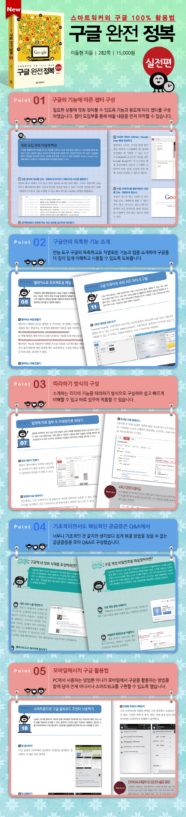 ±¸±ÛÀÇ ±â´ÉµéÀ» Ȱ¿ëÇϸé ÀÏ¹Ý Á÷ÀåÀεµ ºñÁî´Ï½º¸¦ À§ÇØ ±¸±ÛÀ» Ȱ¿ëÇÏ´Â ±â¾÷µµ ´õ ÀÚÀ¯·Ó°í ½º¸¶Æ®ÇÑ ¾÷¹«°¡ °¡´ÉÇØÁø´Ù. ÀÌ Ã¥Àº ±¸±ÛÀÇ °¢Á¾ µµ±¸¿Í ±â´ÉµéÀ» µû¶óÇØ º¸¸é¼­ ½Ç¹«¿¡ ¹Ù·Î Àû¿ëÇÒ ¼ö ÀÖµµ·Ï ±¸¼ºÇß´Ù.