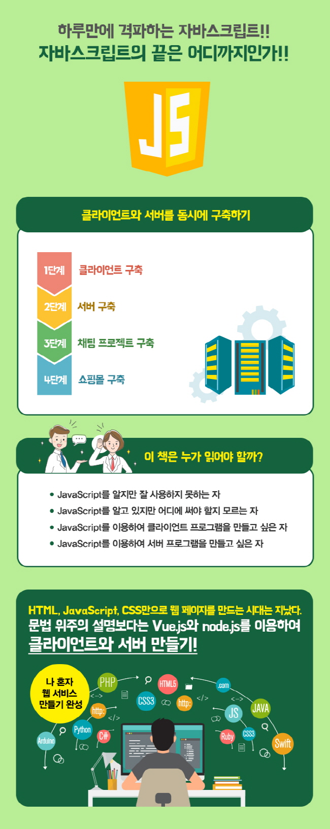 Javascript¿¡¼­ vue.js ¶óÀ̺귯¸®¿Í node.js¸¦ ÀÌ¿ëÇÏ¿© ¼­¹ö¿Í ÇÁ·ÐÆ® ¿µ¿ªÀ» °³¹ßÇÒ ¼ö Àִ åÀ¸·Î, ÇÁ·Î±×·¡¹ÖÀ» °æÇèÇÏÁö ¸øÇÑ »ç¶÷µéµµ ½±°Ô º¼ ¼ö ÀÖµµ·Ï ÃÖ¼ÒÇÑÀÇ ¹®¹ýÀ» ¼³¸íÇϰí ÀÖ´Ù. ÃÑ ³× ´Ü°è·Î, Ŭ¶óÀÌ¾ðÆ® ±¸ÃàÀ» ½ÃÀÛÀ¸·Î ¼­¹ö¸¦ ±¸ÃàÇϰí, äÆÃ°ú ¼îÇθôÀ» ±¸ÃàÇϸç È¥ÀÚ À¥ ¼­ºñ½º¸¦ ¶Òµü ¸¸µé ¼ö ÀÖ´Ù.