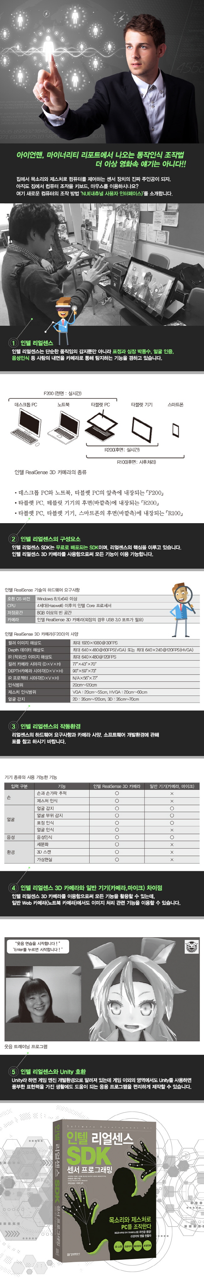 ÀÌ Ã¥Àº ÀÎÅÚ ¸®¾ó¼¾½º SDK¸¦ »ç¿ëÇϱâ À§ÇØ ÇÊ¿äÇÑ Á¤º¸¸¸À» ÇÑÁ¤ÀûÀ¸·Î Á¦°øÇϰí ÀÖ½À´Ï´Ù. ¶ÇÇÑ, ÀÌ Ã¥¿¡¼ »ç¿ëµÇ´Â °¢Á¾ ±â¼ú(ÇÁ·Î±×·¡¹Ö ¾ð¾î, OpenCV¿Í WPF µîÀÇ ÇÁ·¹ÀÓ¿öÅ© °ü·Ã, Visual Studio, Unity, openFramework µî)¿¡ °üÇØ Àαâ ÀÖ´Â °³¹ßȯ°æÀÇ »ç¿ë ¹æ¹ý°ú Tips¸¦ ÀÚ¼¼È÷ ¼³¸íÇϰí ÀÖ½À´Ï´Ù.